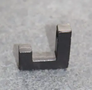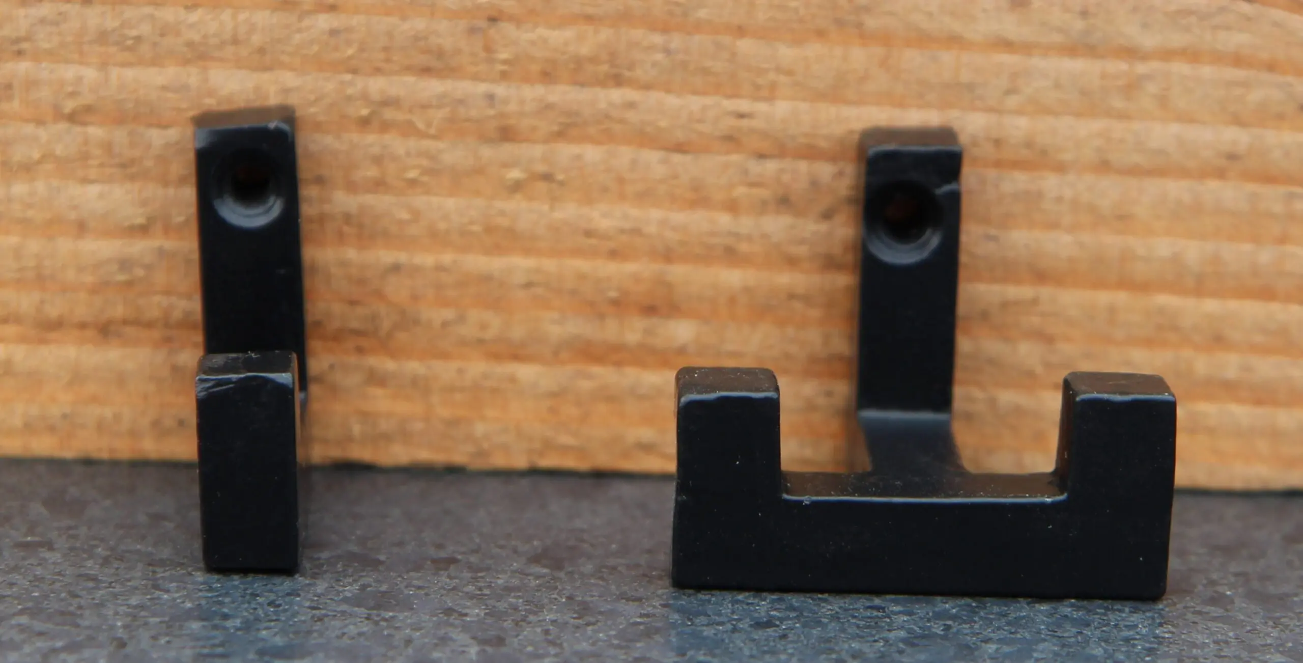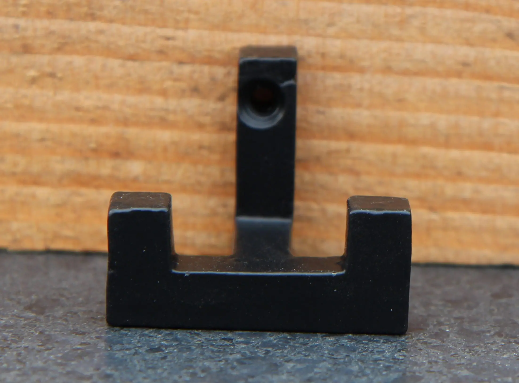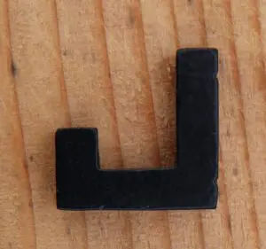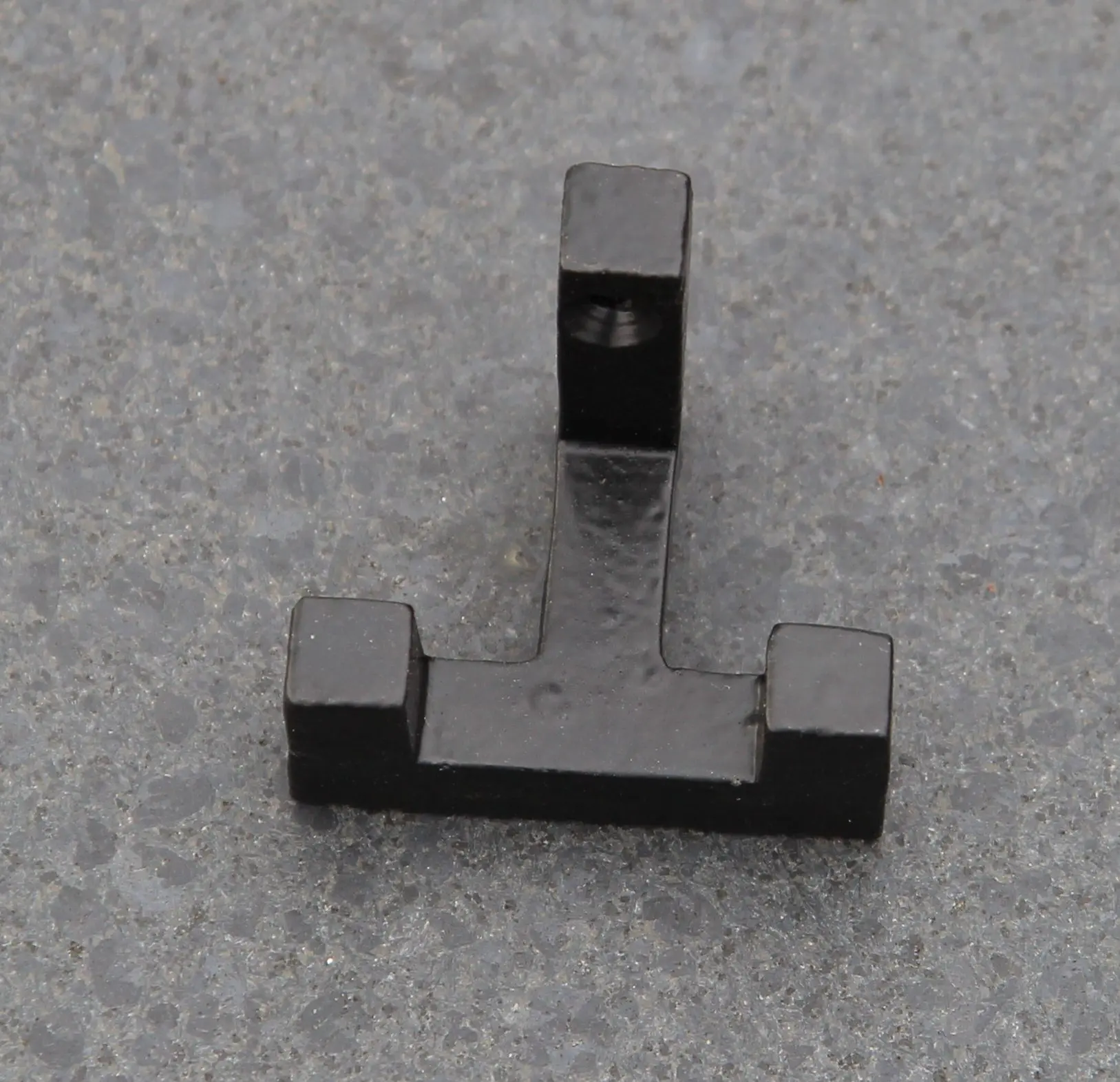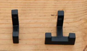 Een strak, hoekige zwarte gietijzeren kapstokhaak met dubbele haak.