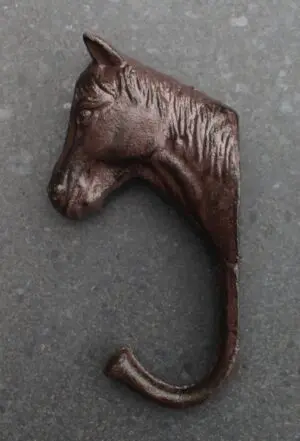 Een grote gietijzeren haak met aan de bovenzijde het hoofd van een paard.