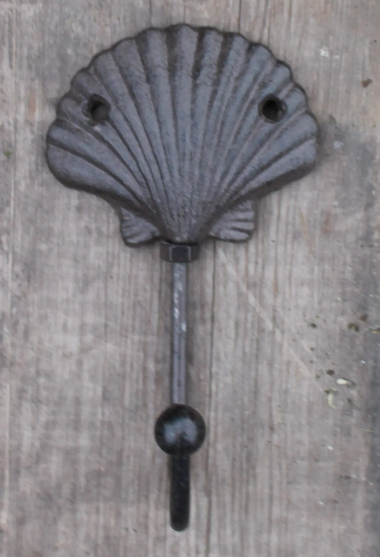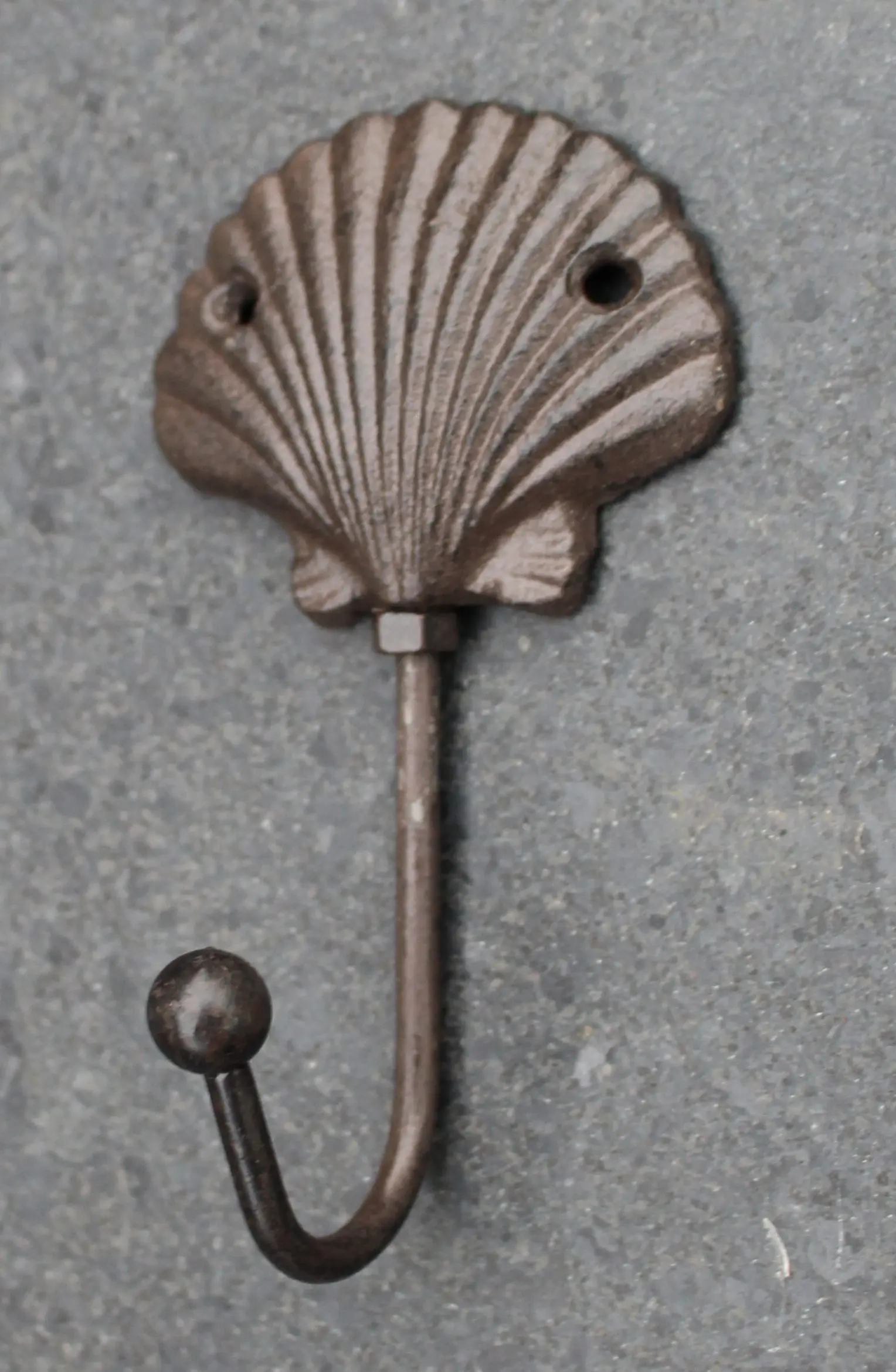 Een gietijzeren kapstokhaak in de vorm van een schelp.