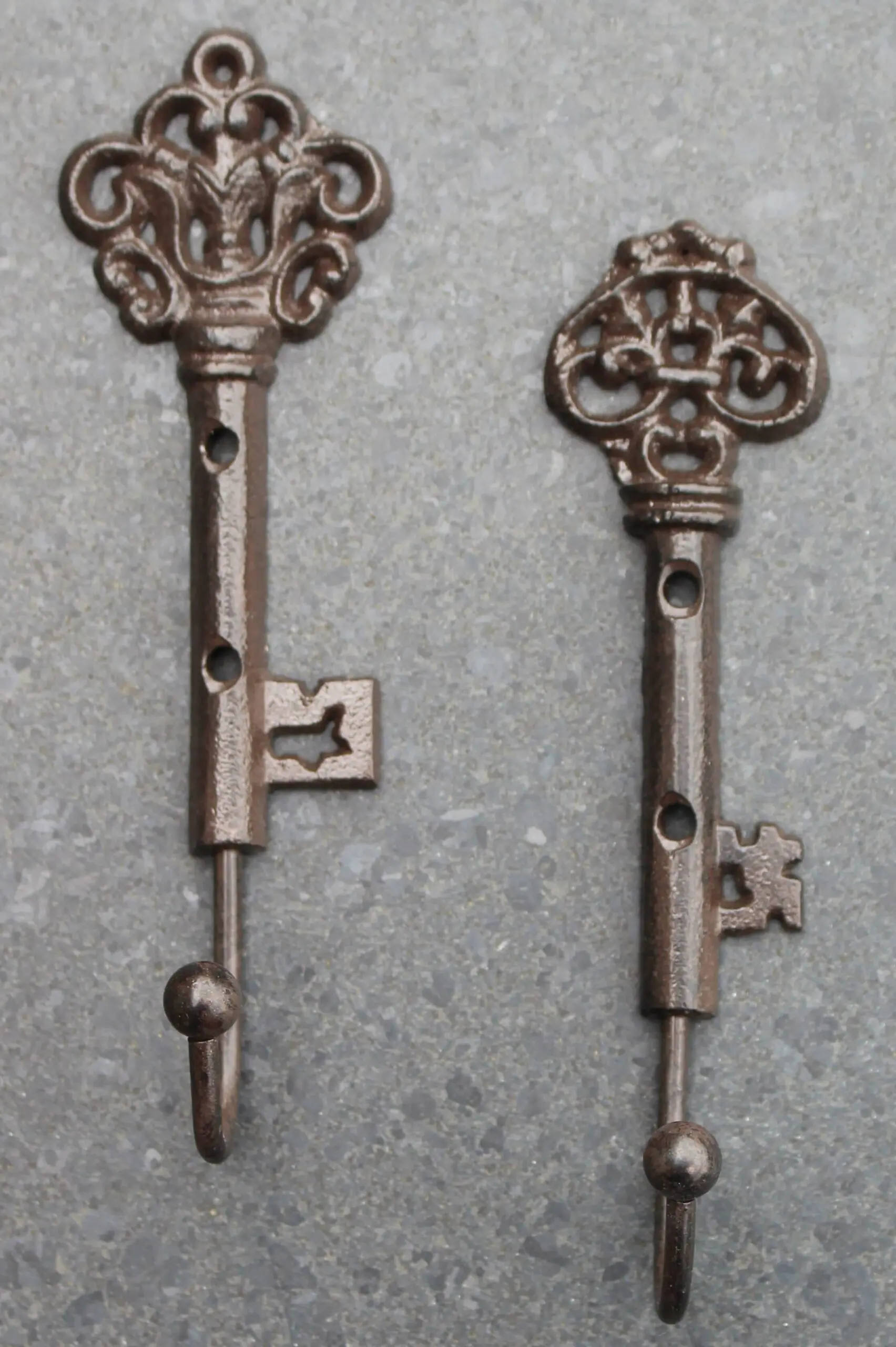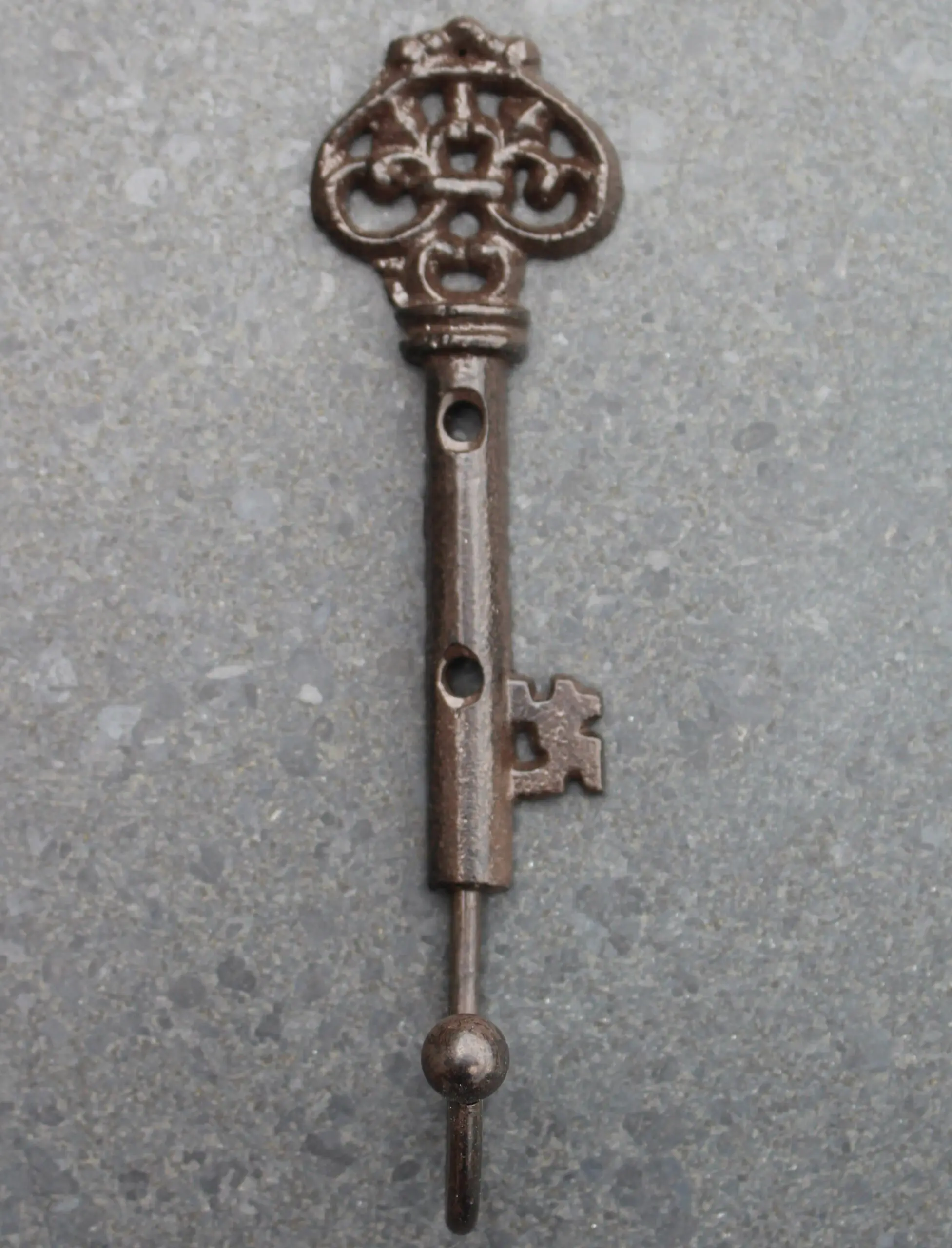 Een gietijzeren haak in de vorm van een mooi afgewerkte sleutel.