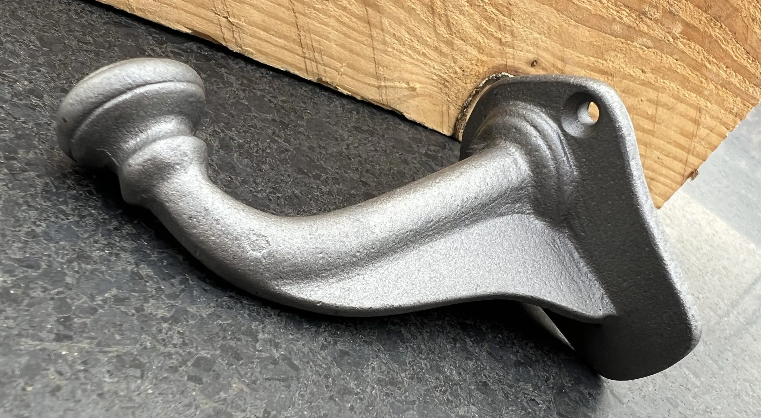 Grijs/ antraciet kleurige gietijzeren kapstokhaak met wandplaat uit één stuk gegoten.