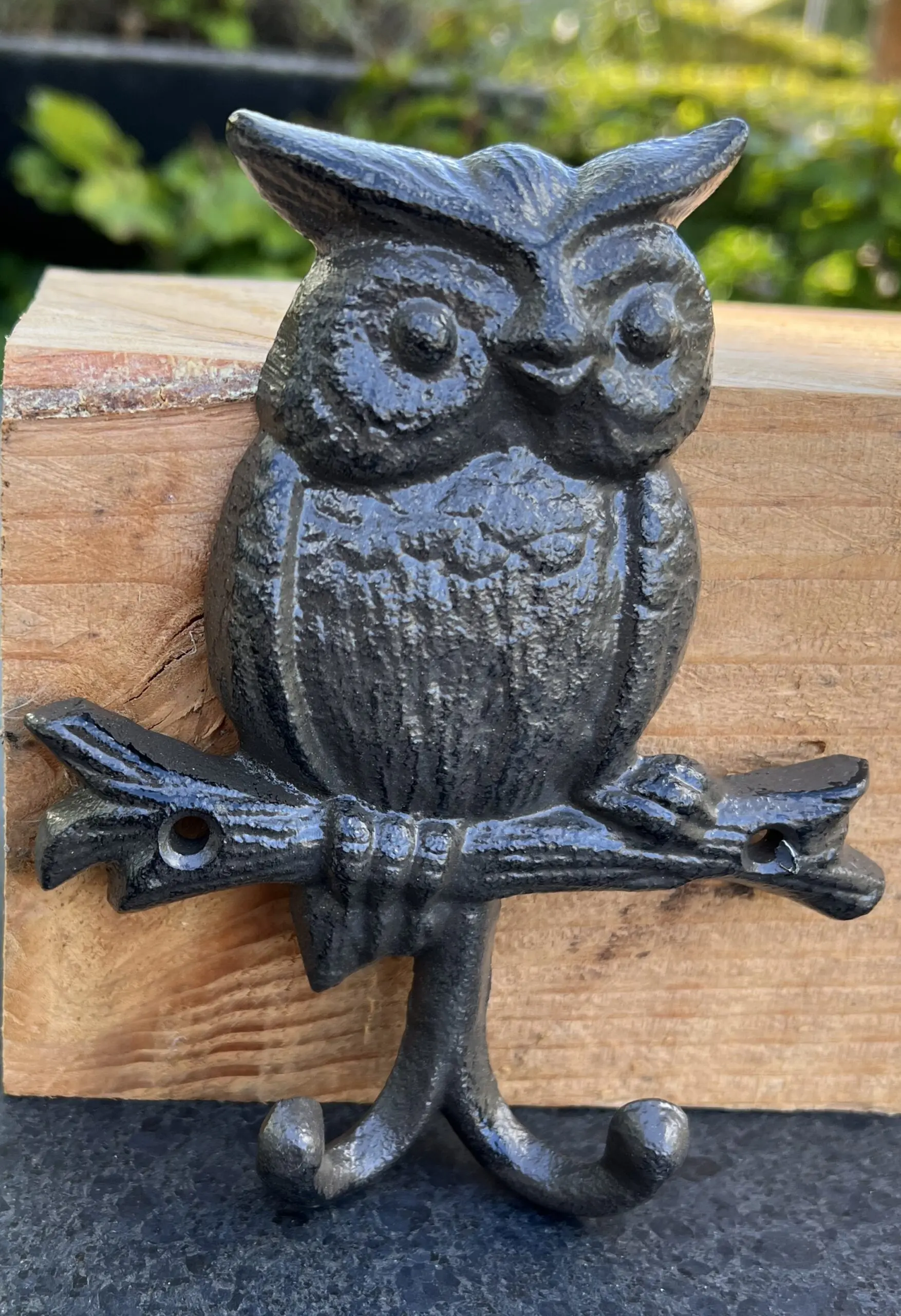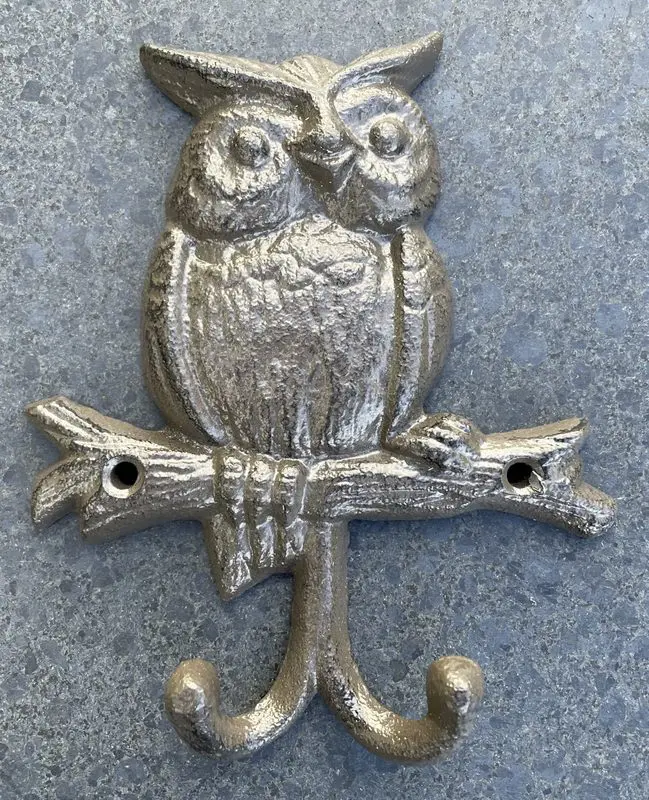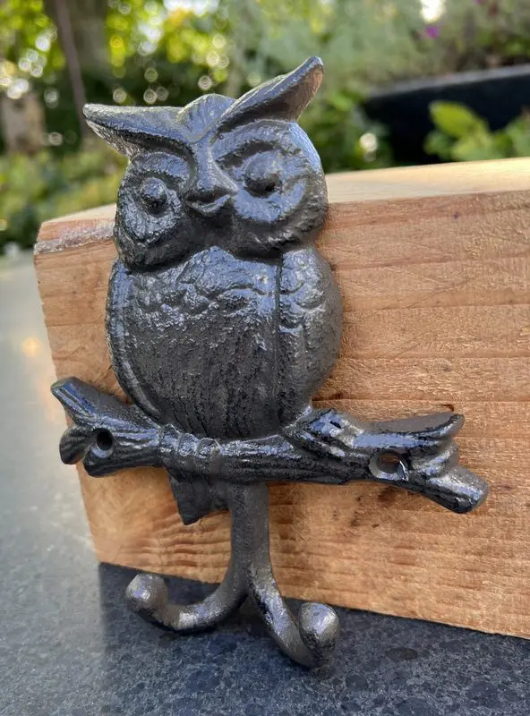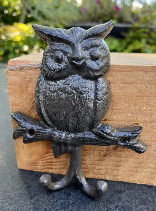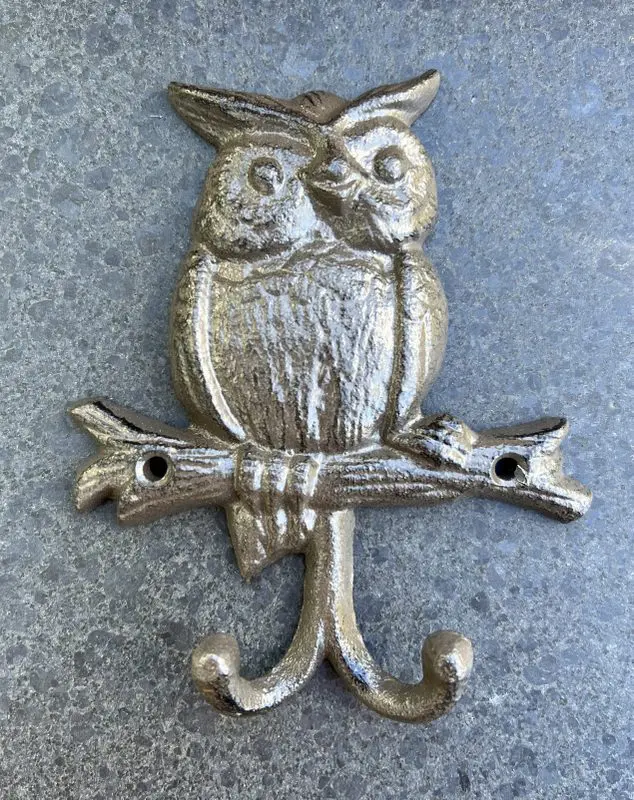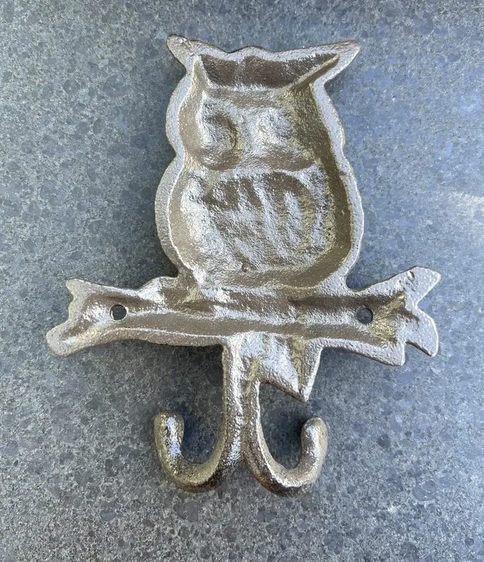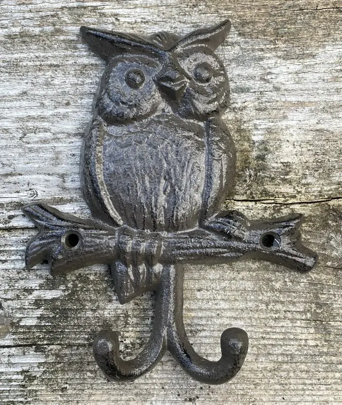 Een donkerbruine gietijzeren haak met afbeelding van een uil.