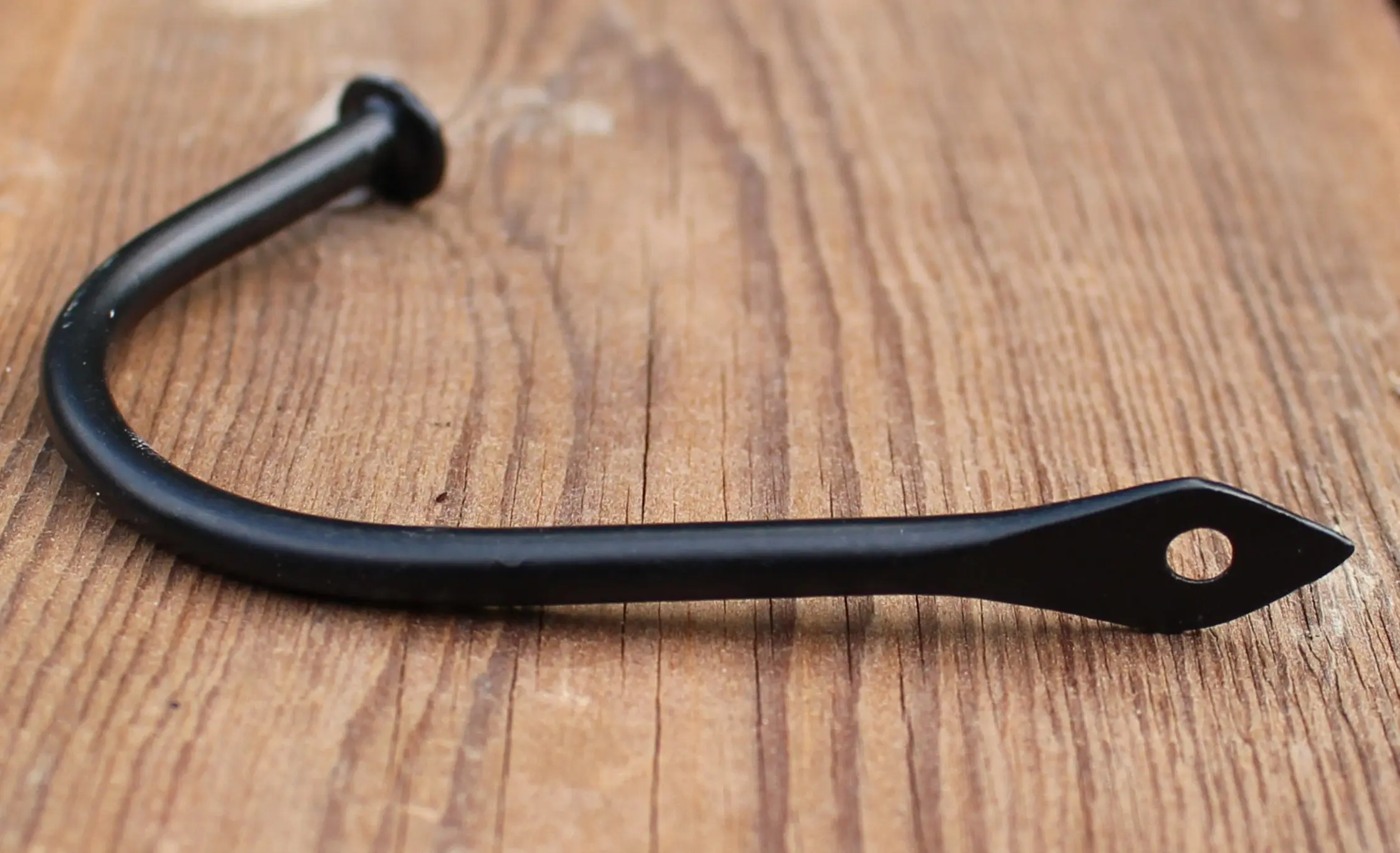 Een zwarte smeedijzeren spijkernagel in een gebogen vorm.