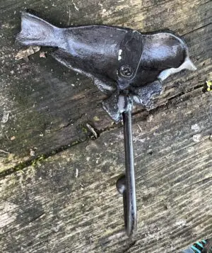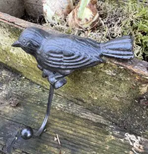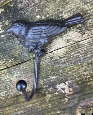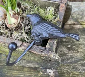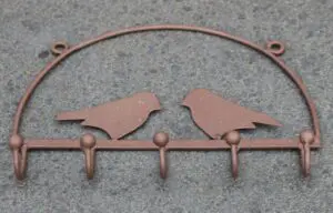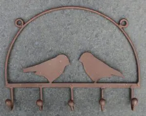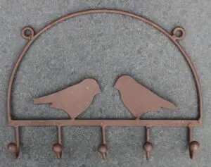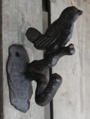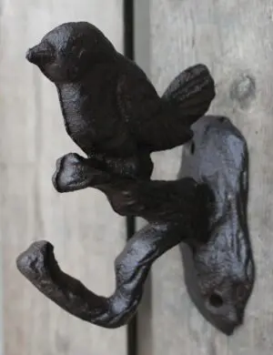 Gietijzeren kapstokhaak met twee vogels als achterplaat.