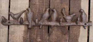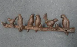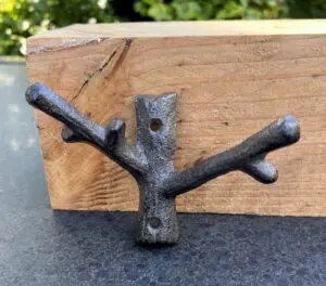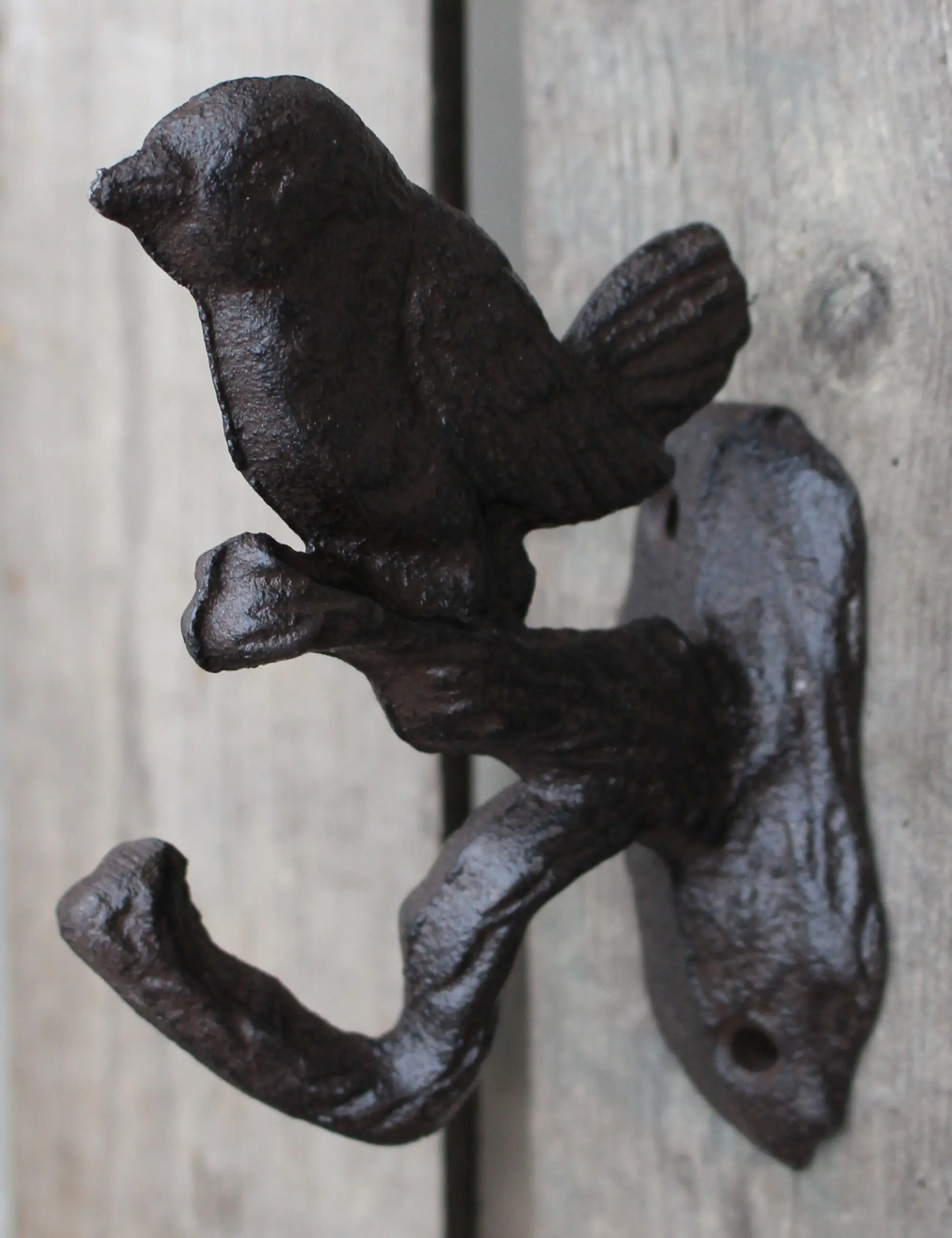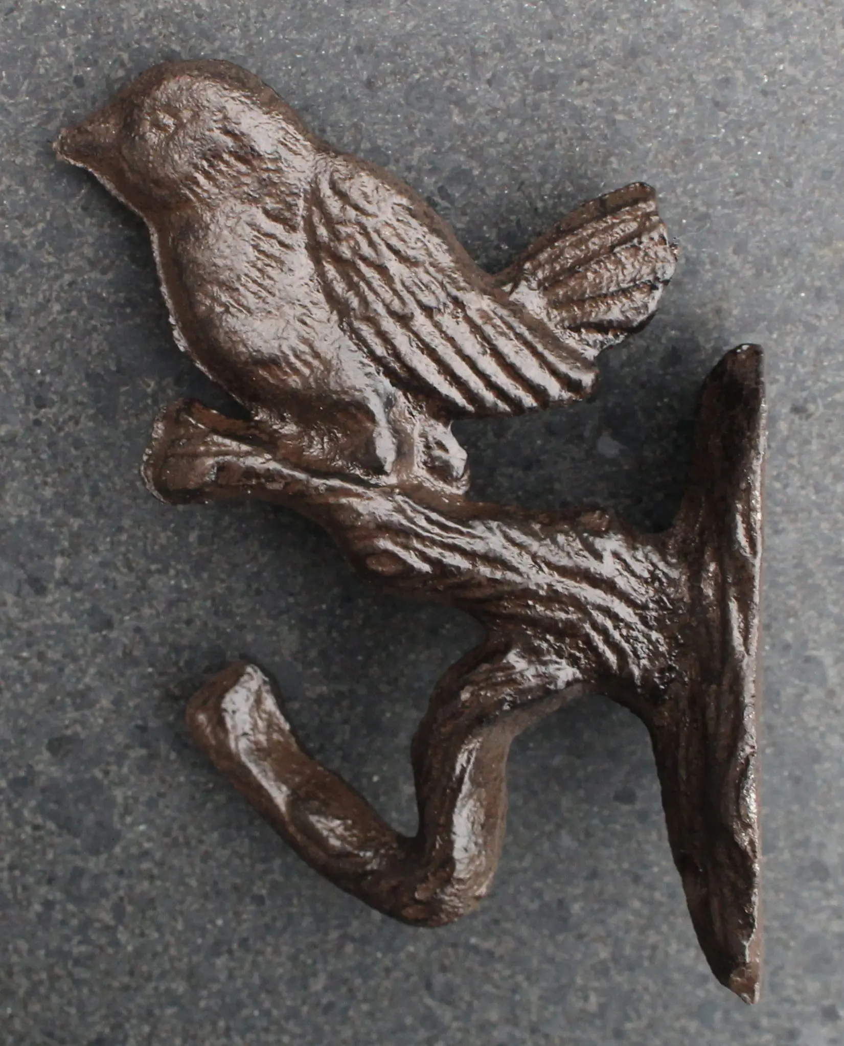 Een mooie gietijzeren kapstokhaak met een vogel die op een tak zit.