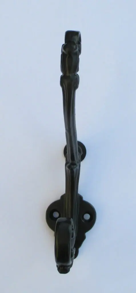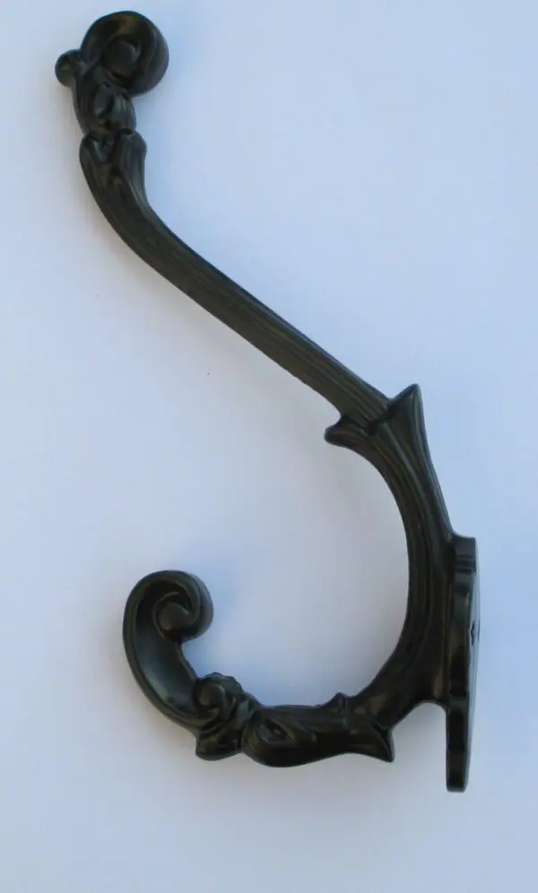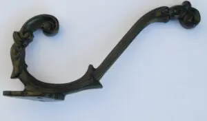 De haak is van gietijzer uit één stuk gegoten en de kleur is donkerbruin met wat zwarte accenten.