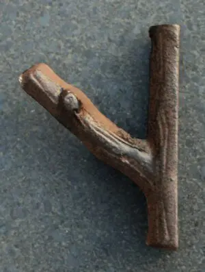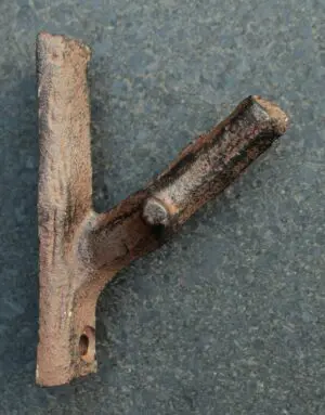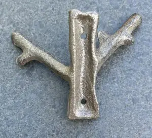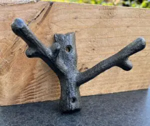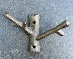 De haak van de kapstok lijkt ook op een tak en is enigzins iets gedraaid.