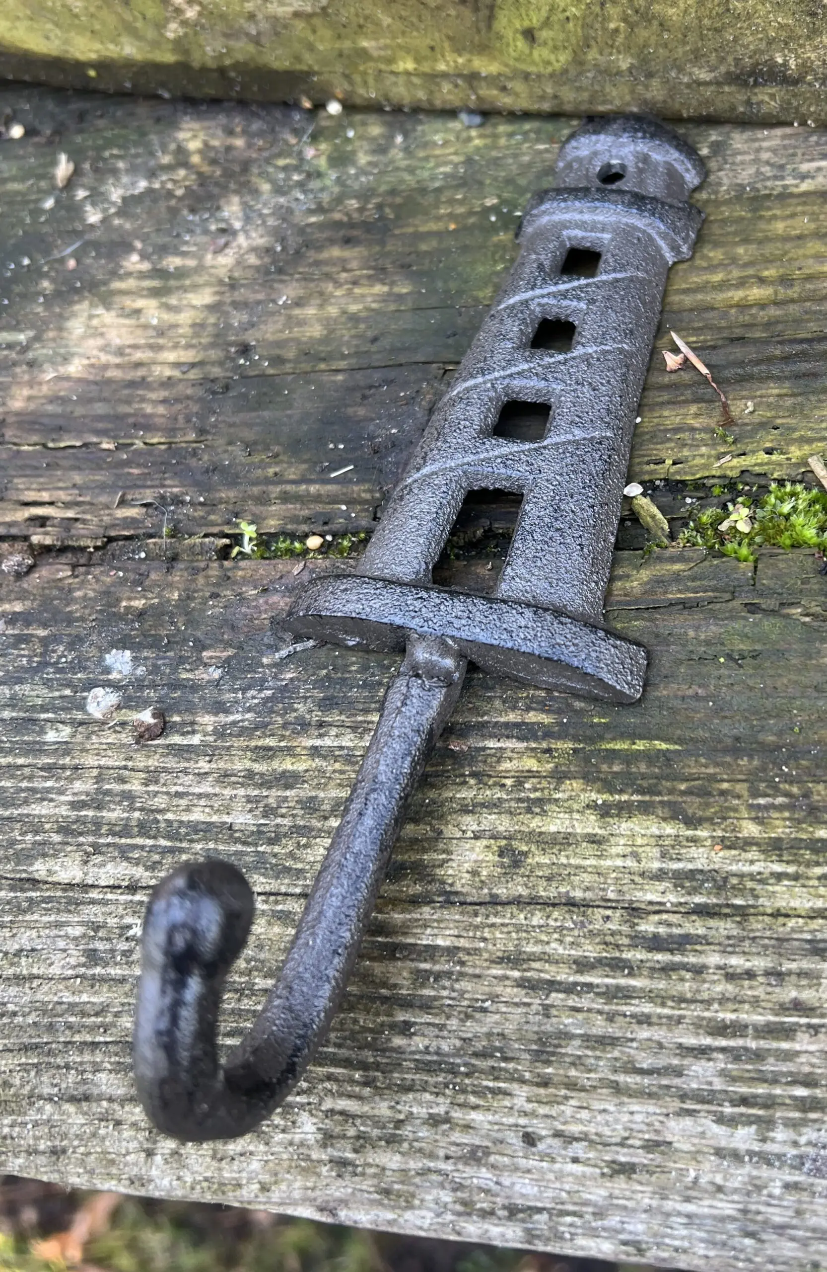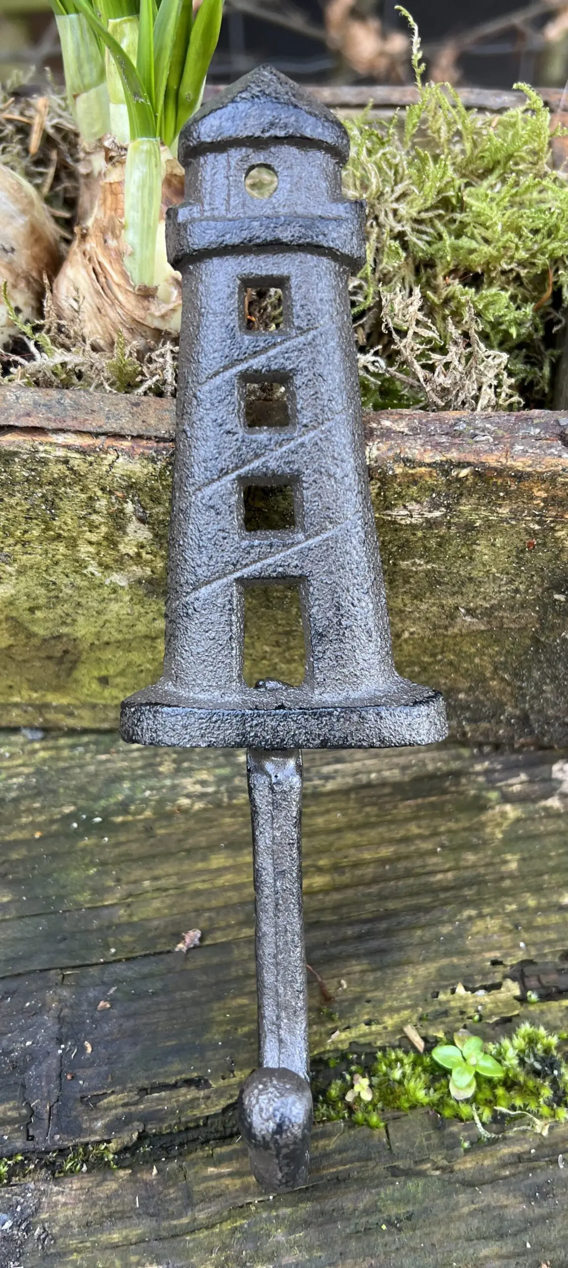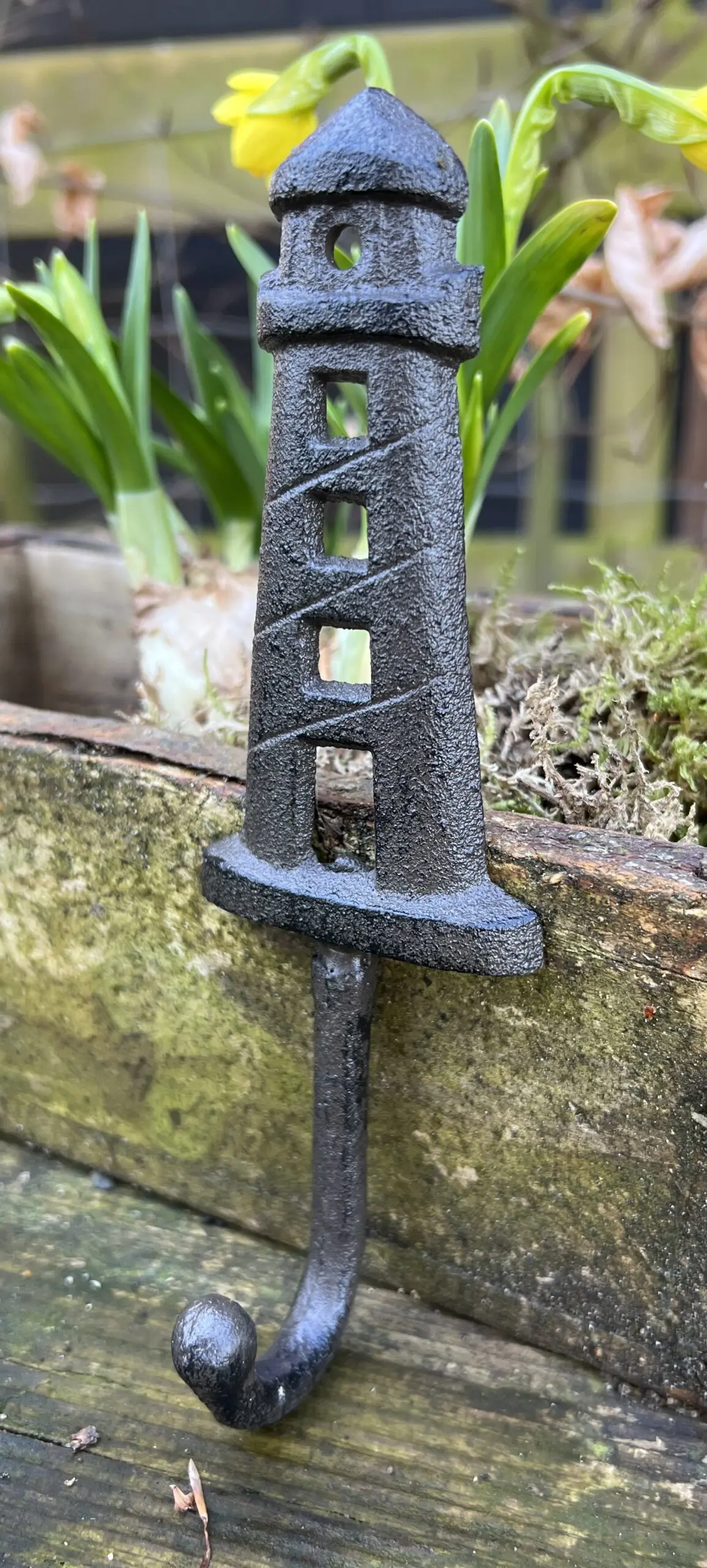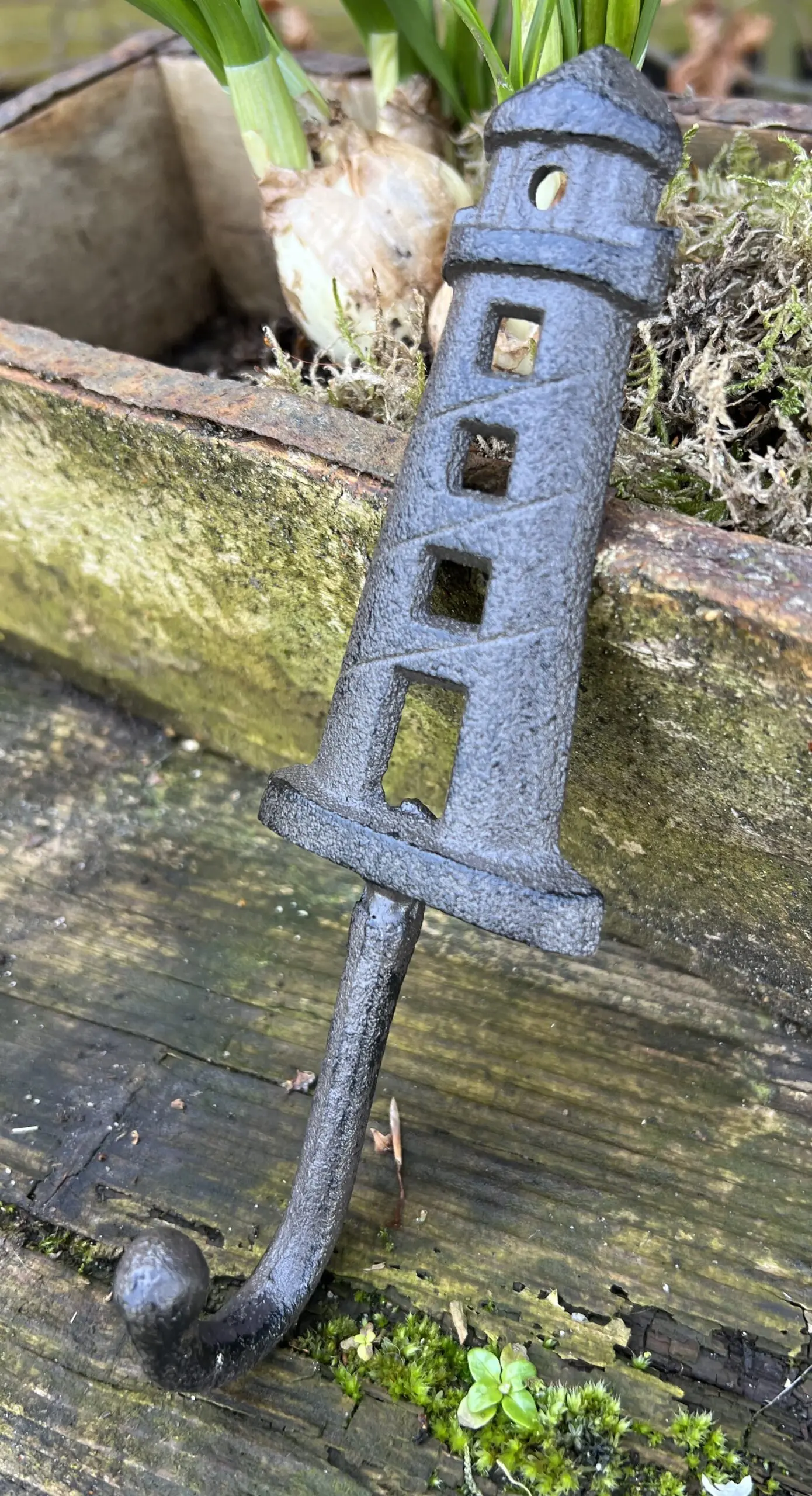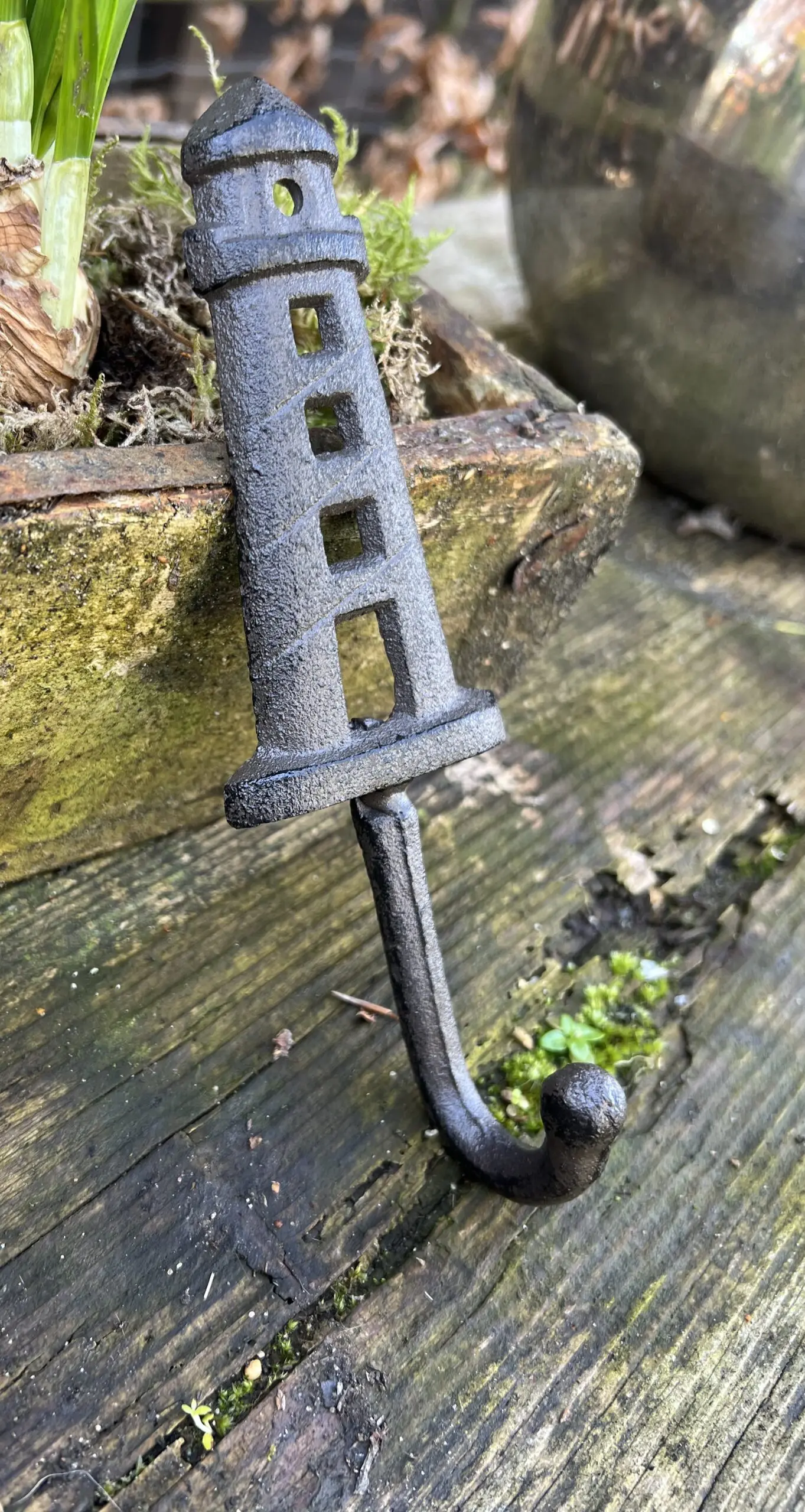 Een grote gietijzeren kapstokhaak vuurtoren.