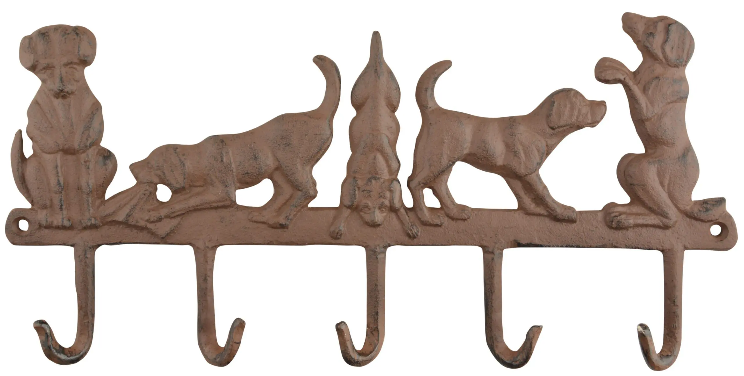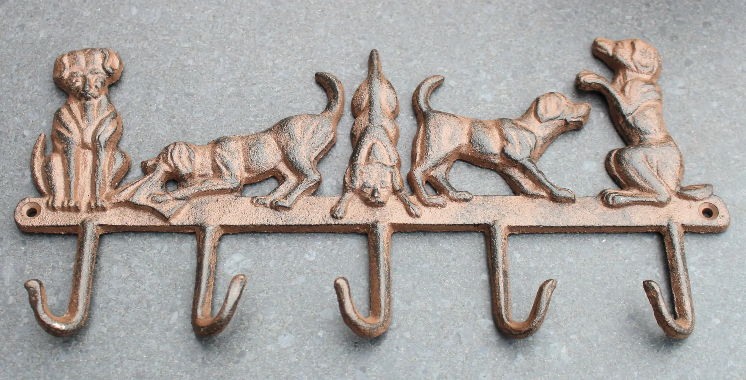 Een gietijzeren decoratieve kapstok met 5 honden en 5 haken.
