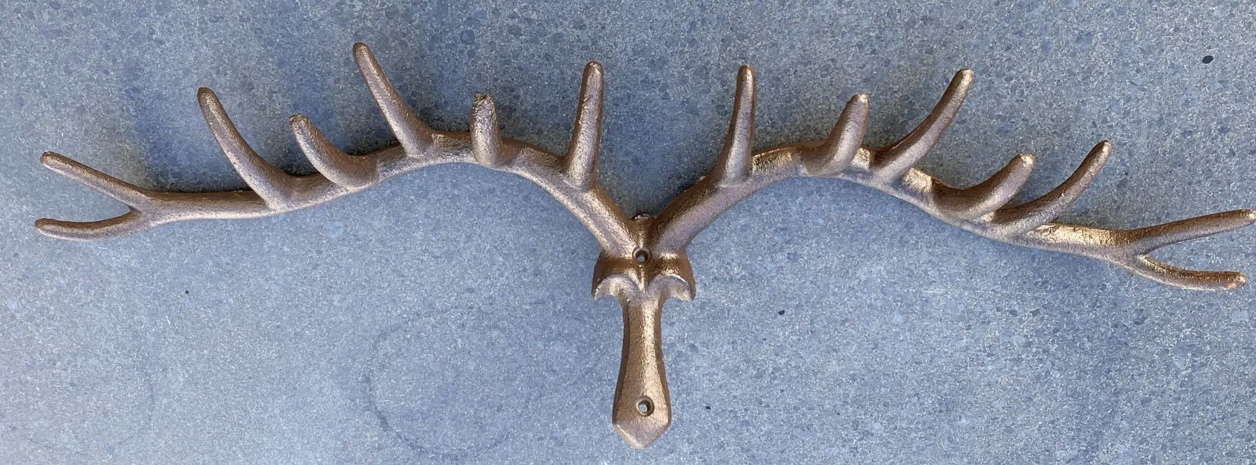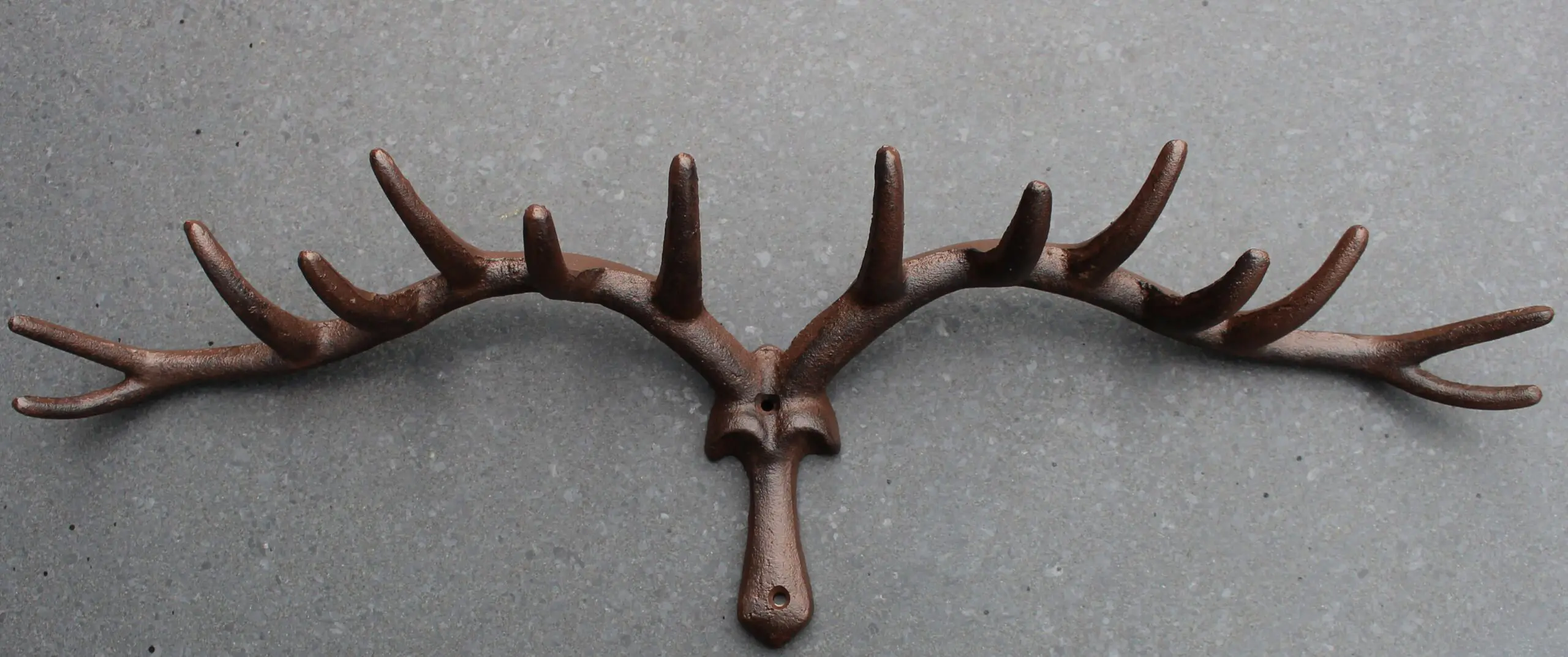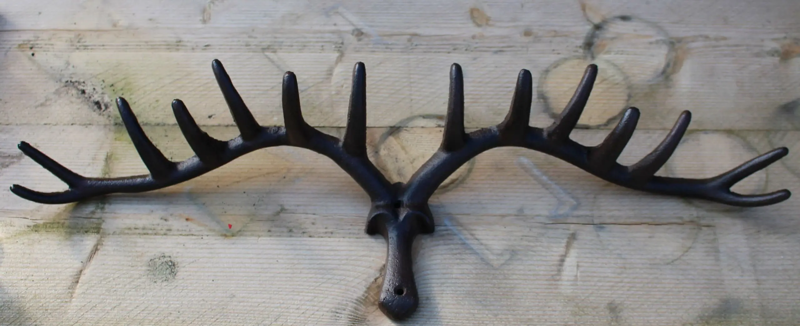 Een grote zware gietijzeren kapstokhaak in de vorm van een gewei.