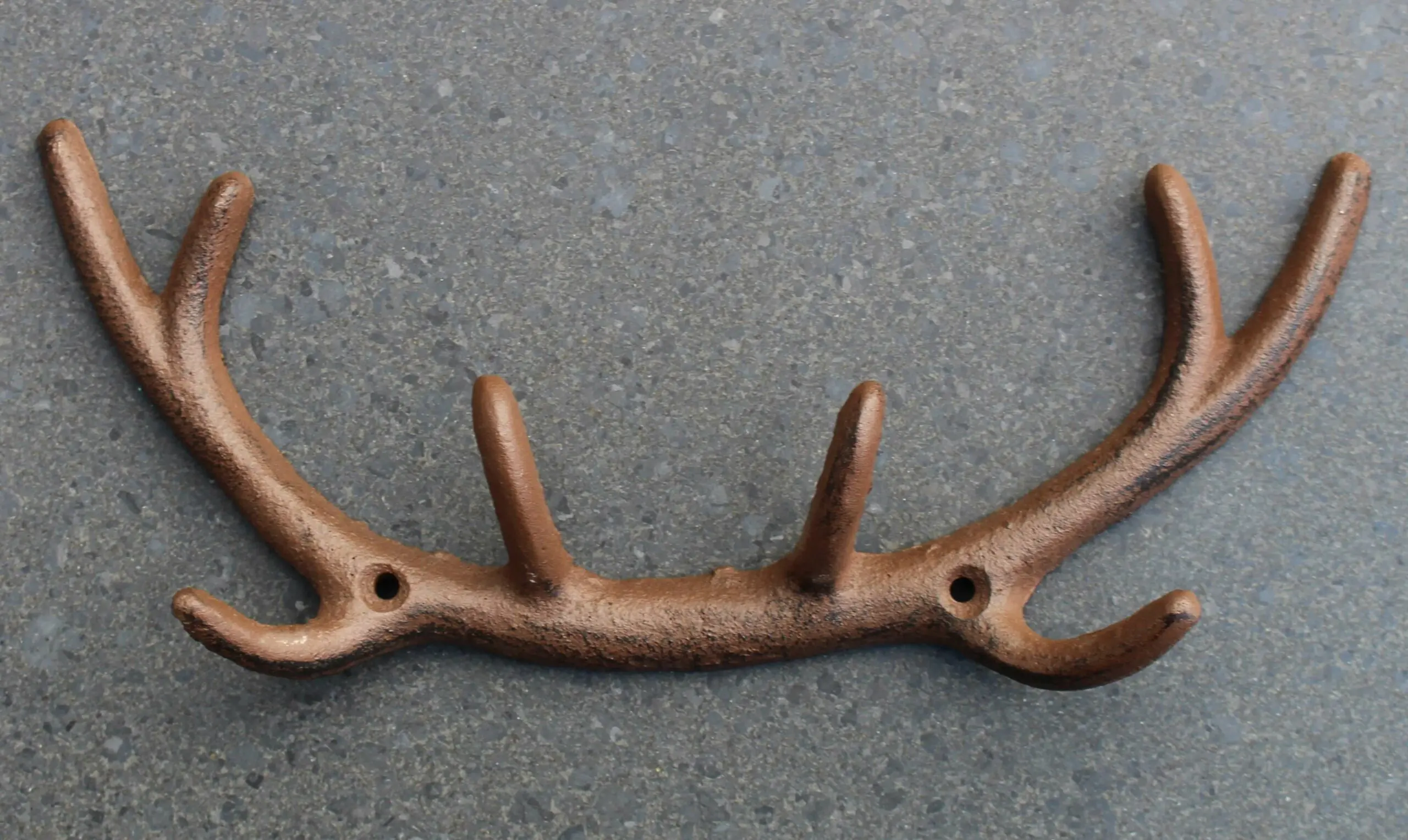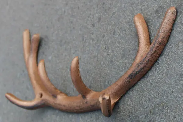 Een gietijzeren kapstokhaak in de vorm van een hertengewei.