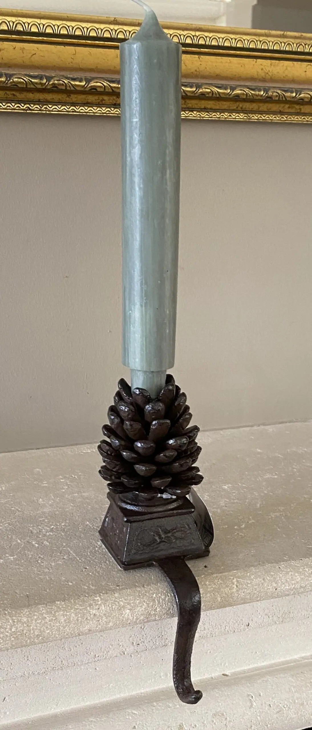 Gietijzeren stockinghanger dennenappel als kaarsen standaard met haak donkerbruin