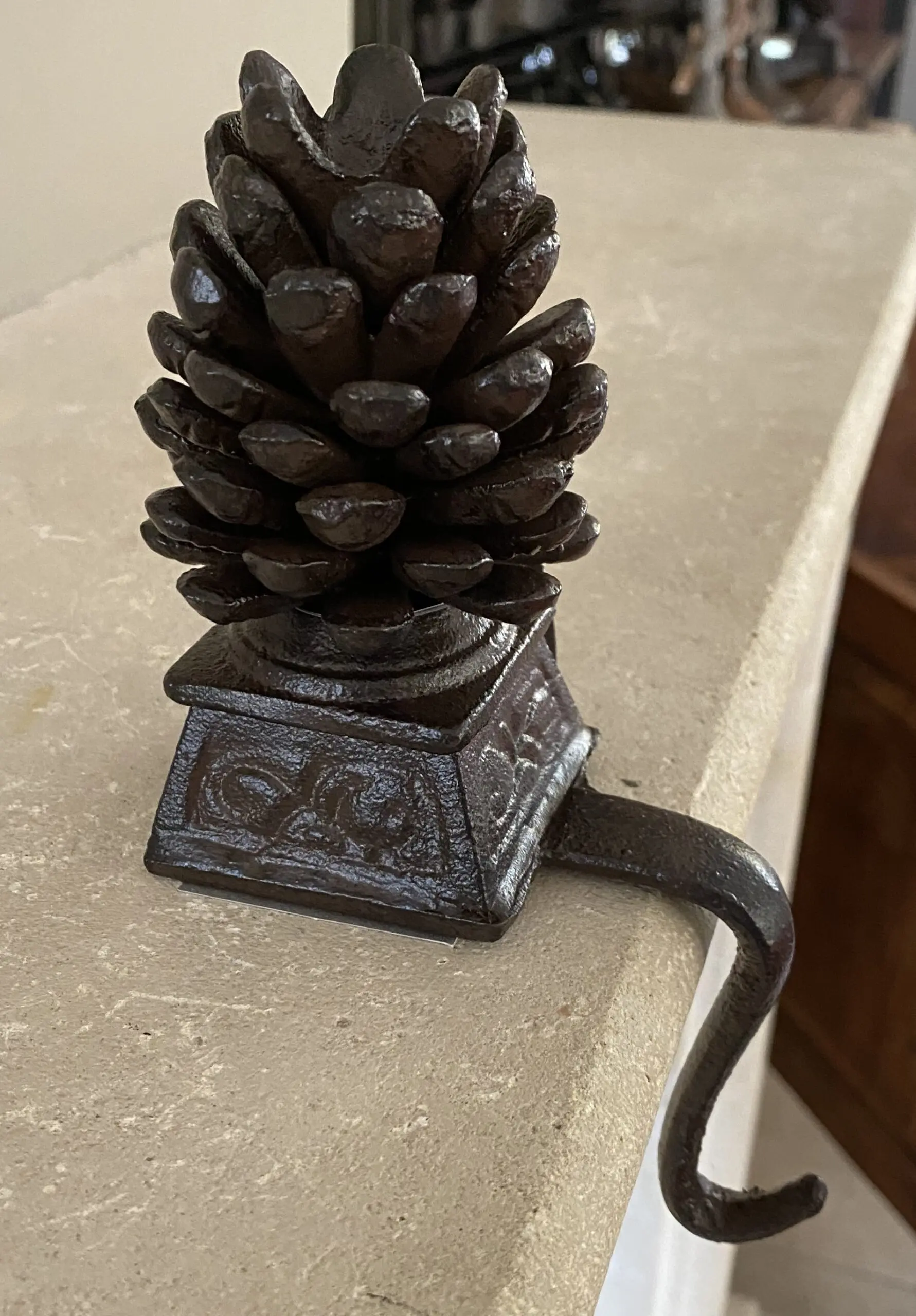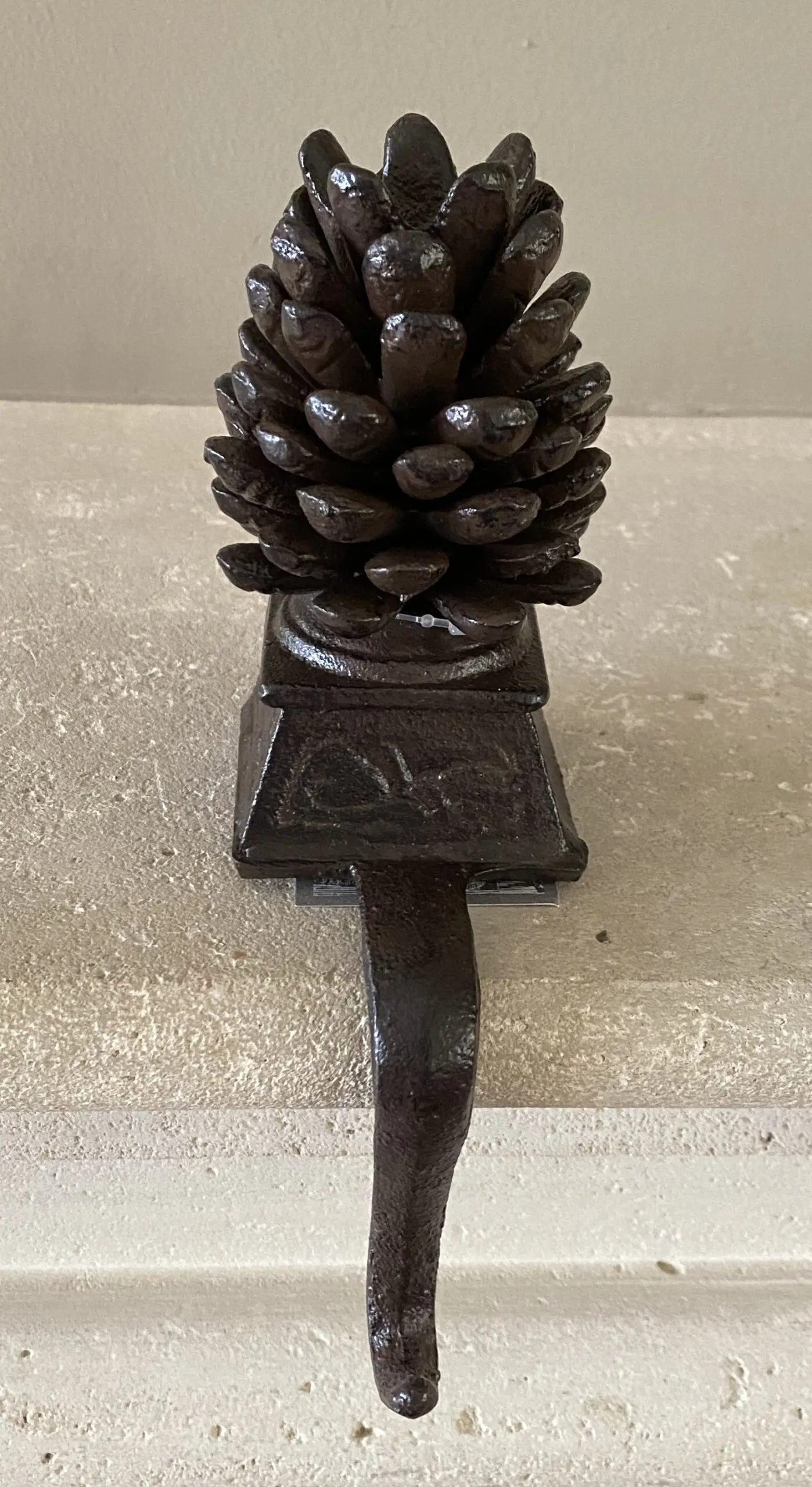 Een gietijzeren stocking hanger met decoratieve dennenappel als knop.