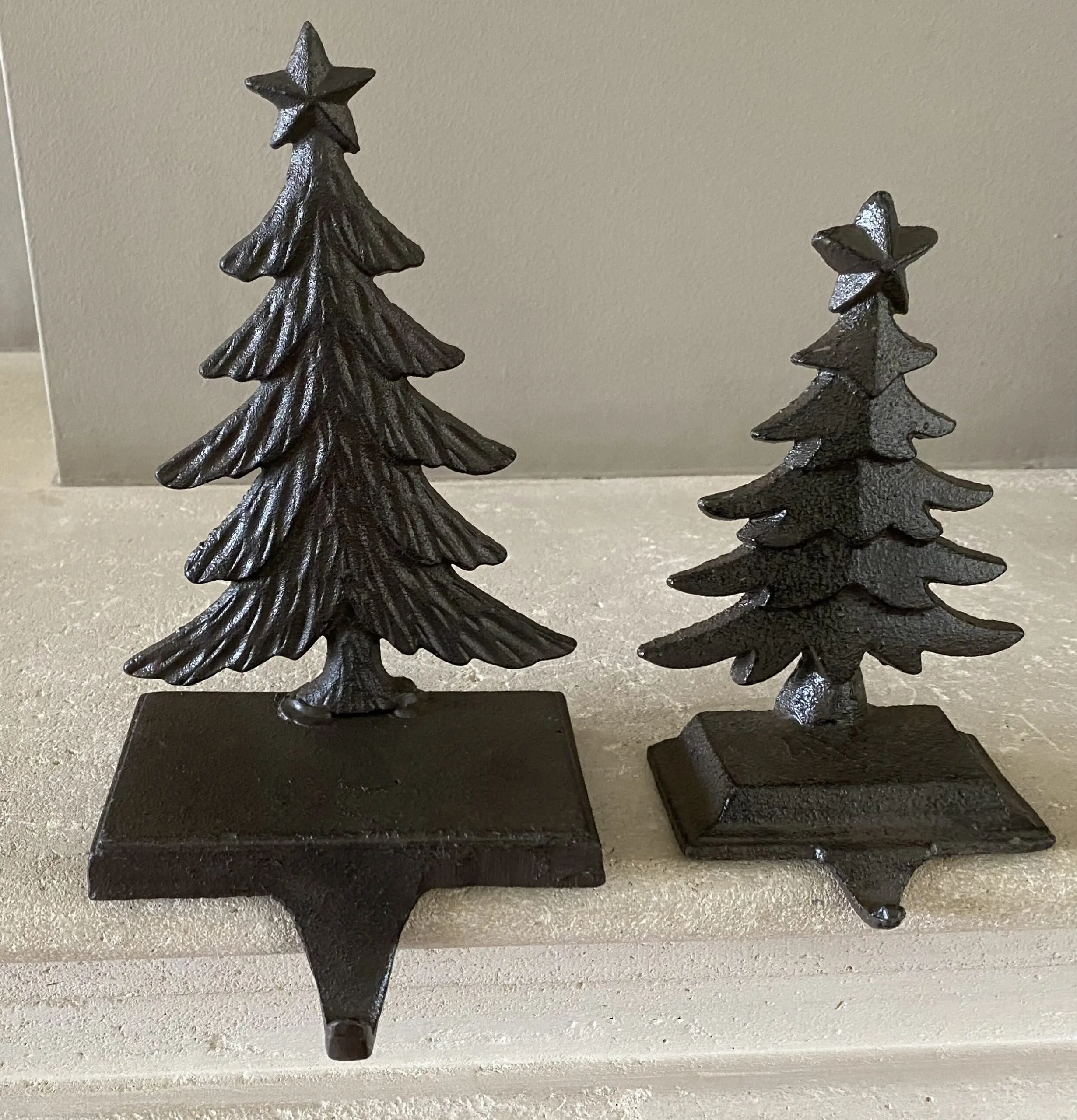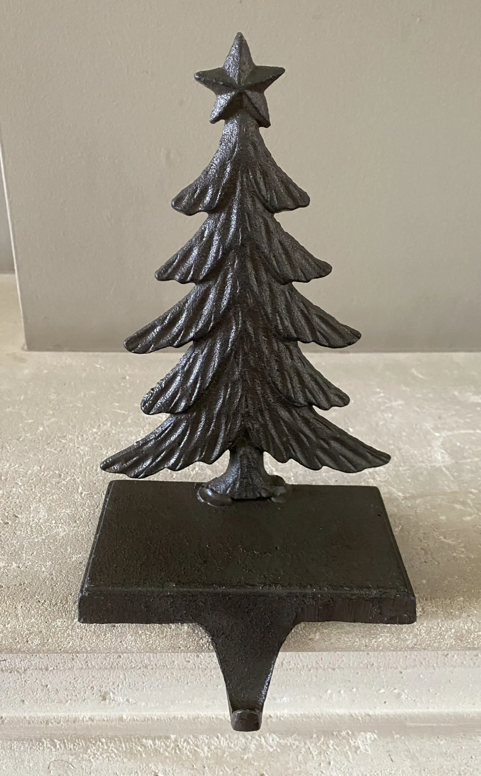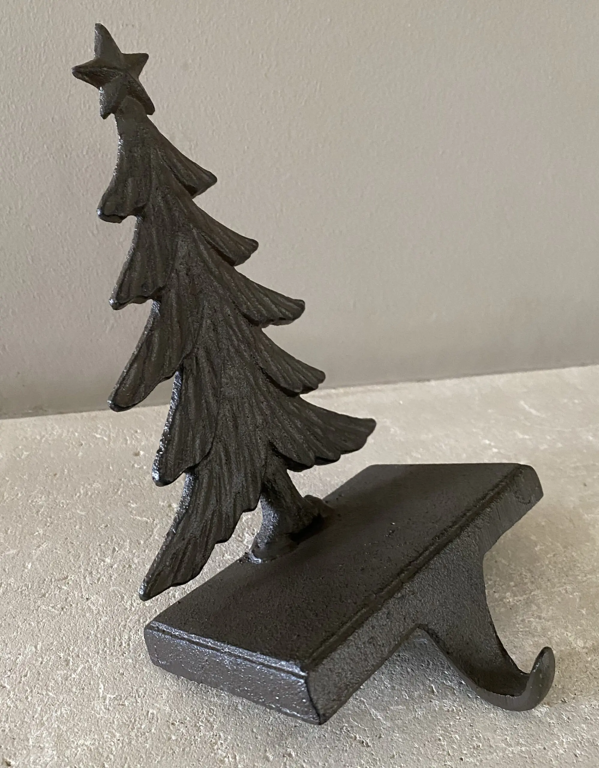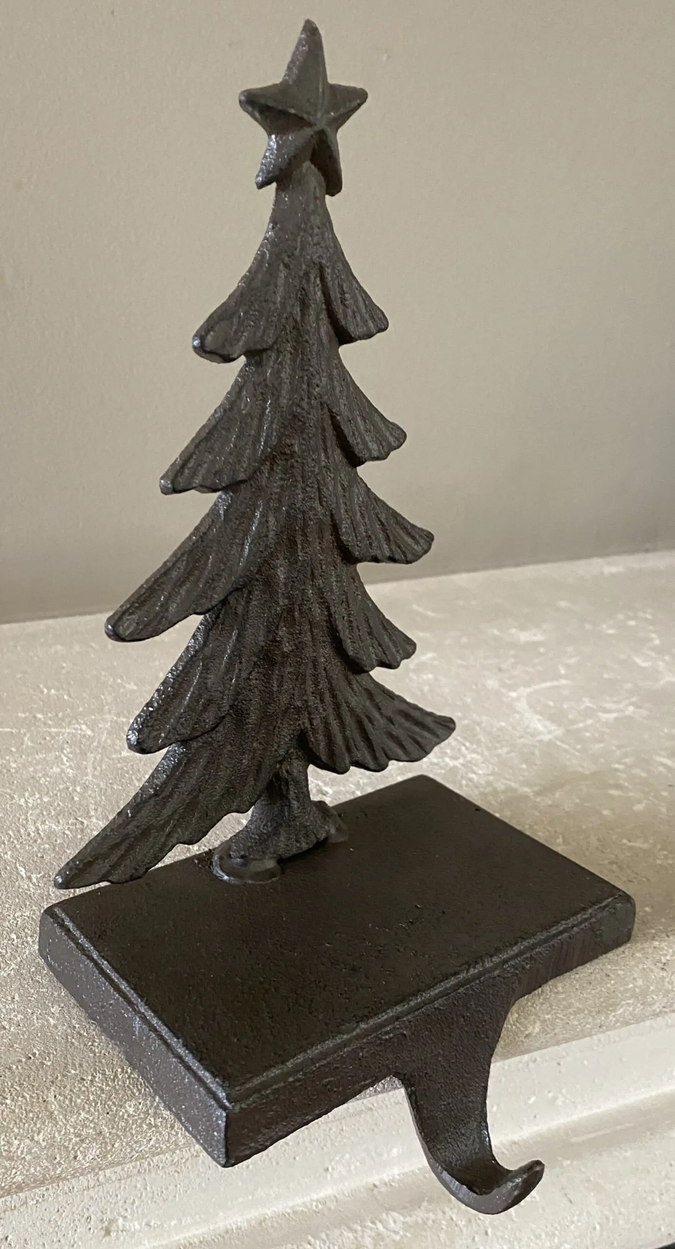Een gietijzeren stocking hanger met dennenboom als aanzicht.