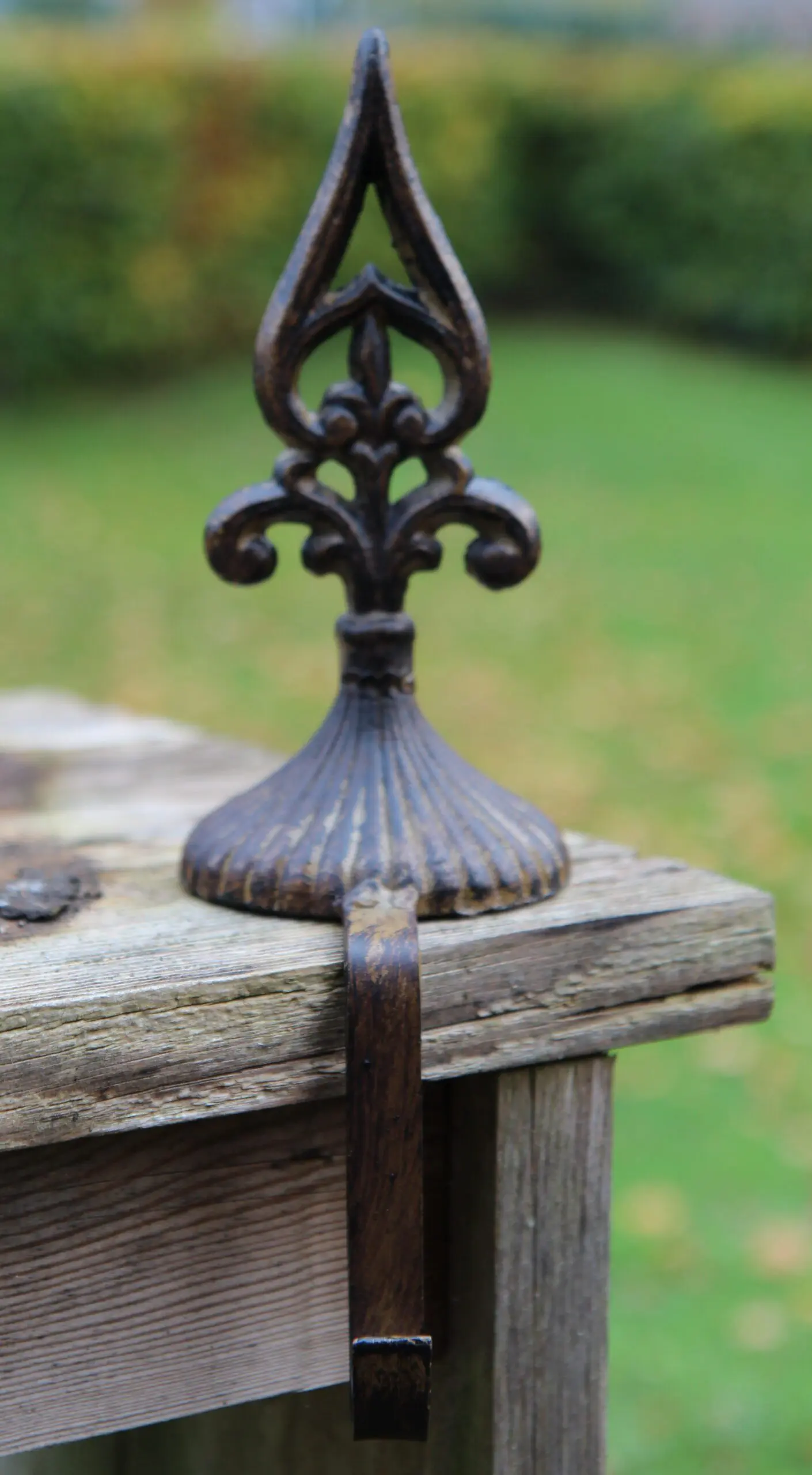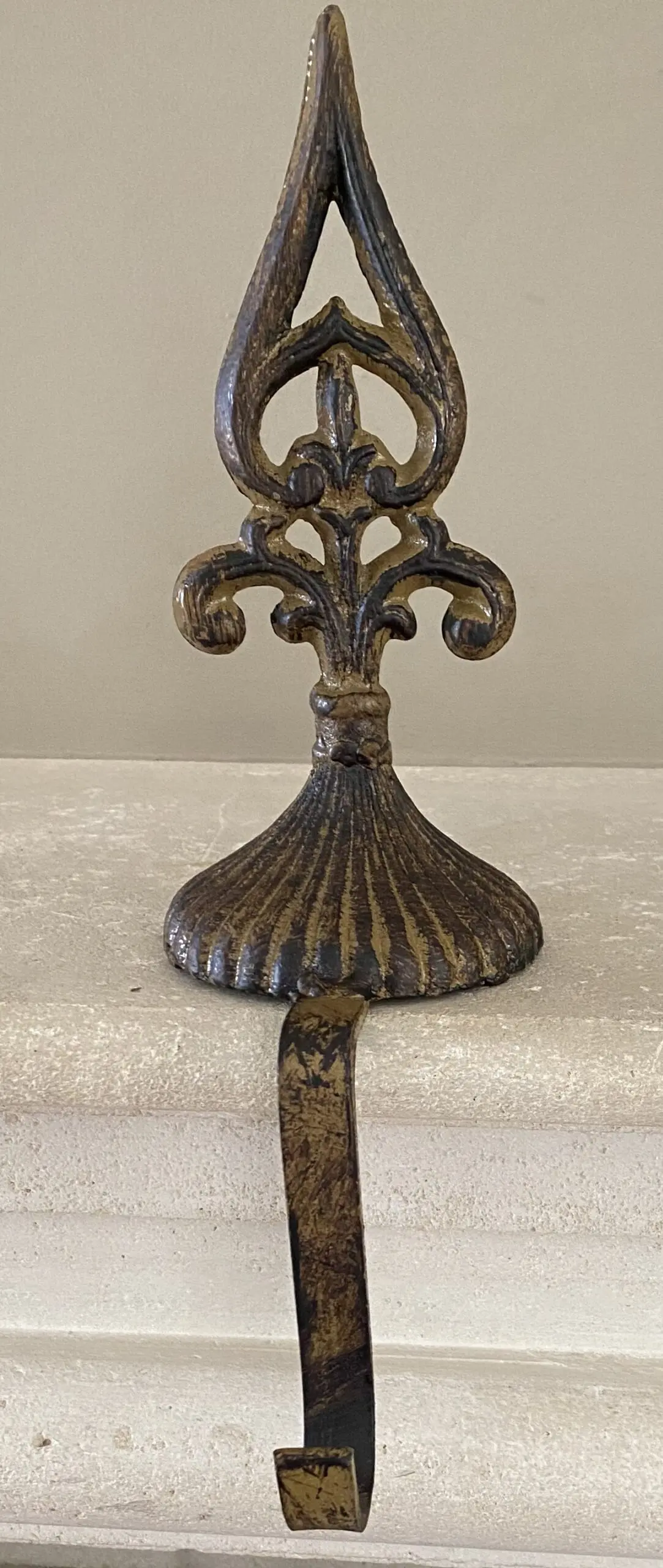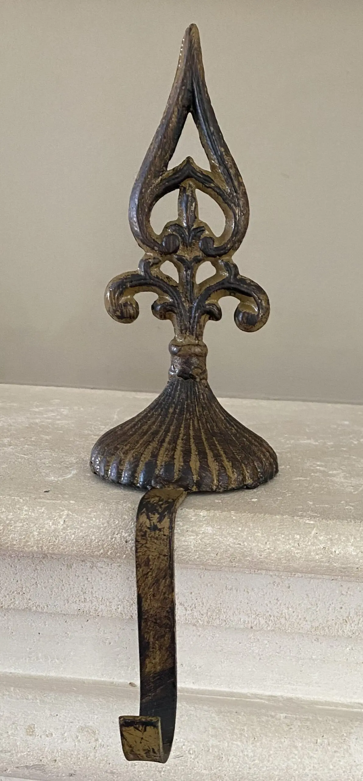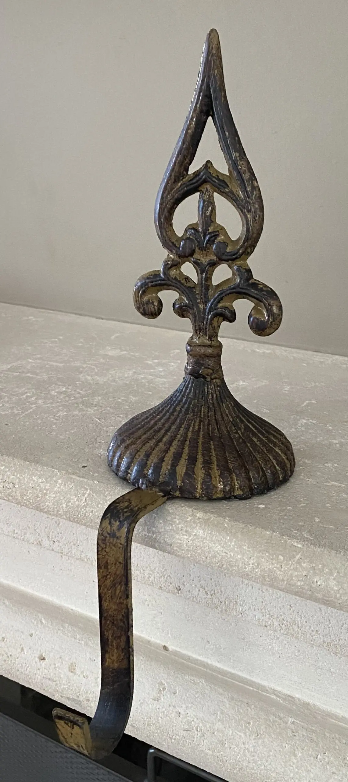 Gietijzeren stocking hanger met daarop een Franse Lelie.