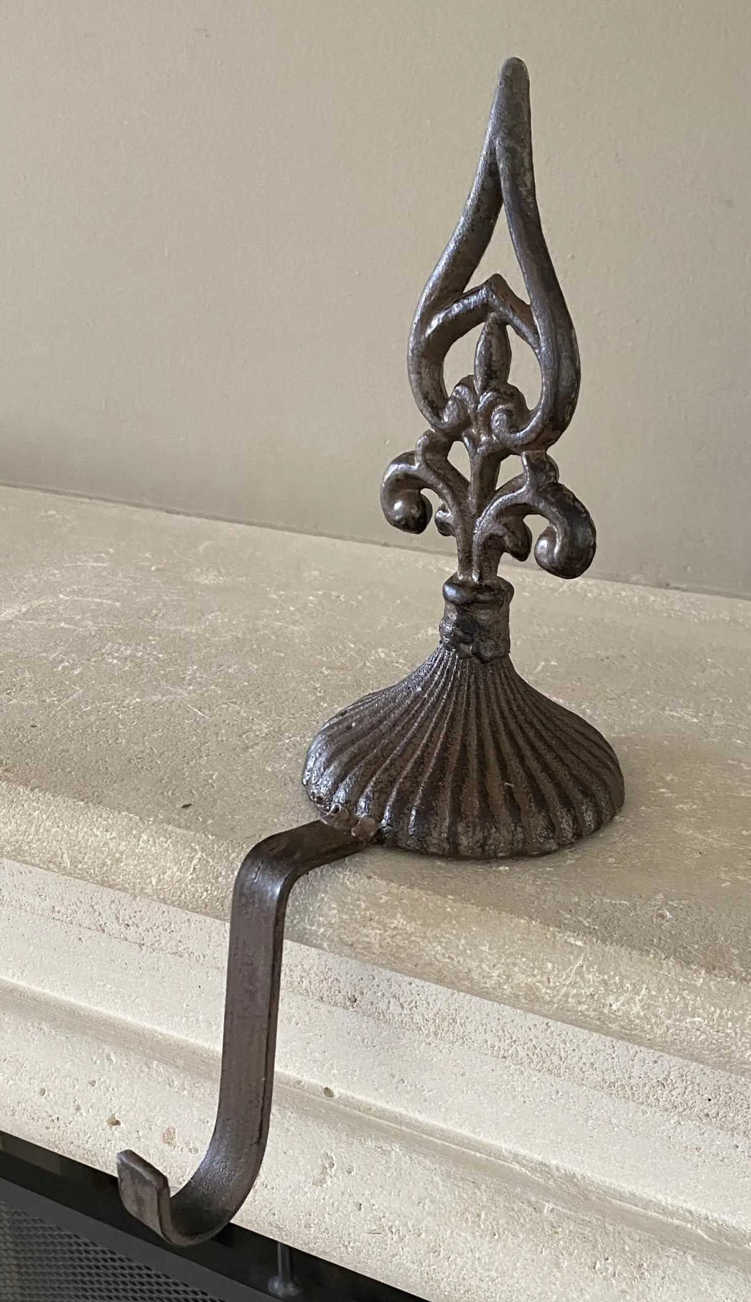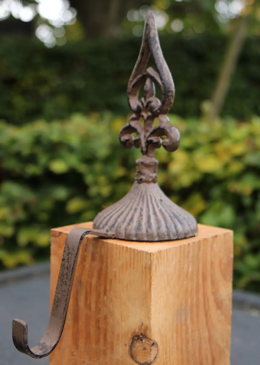 een gietijzeren stocking hanger, kasthaak met een decoratieve Franse Lelie als knop.