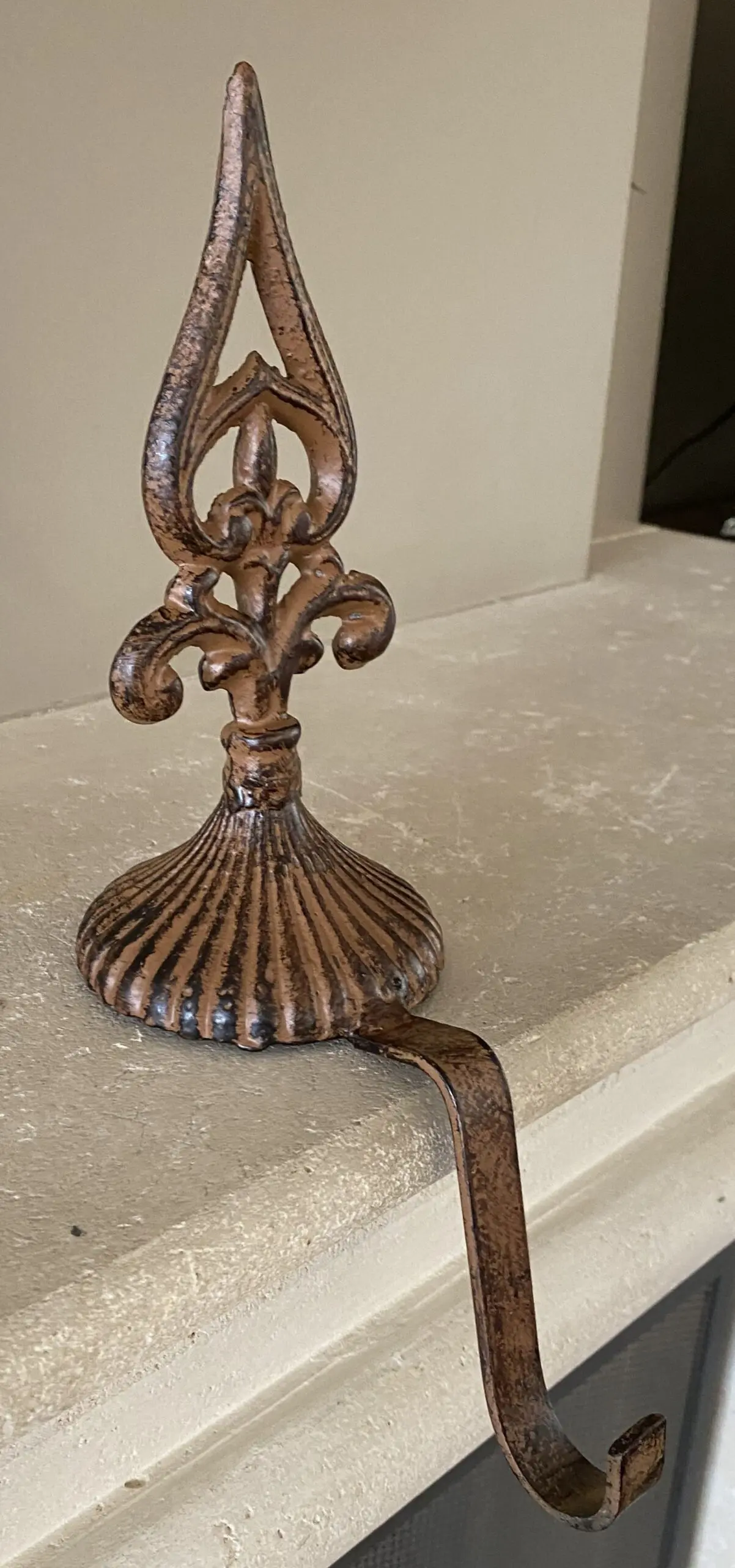 Een gietijzeren stocking hanger met een decoratieve Franse Lelie als knop.