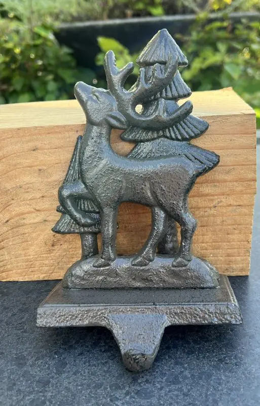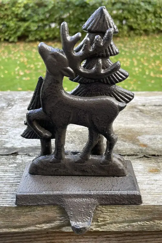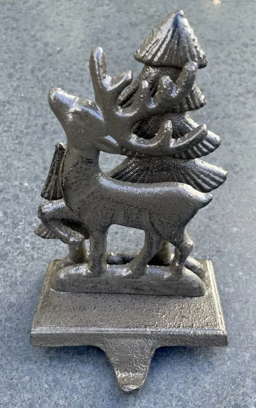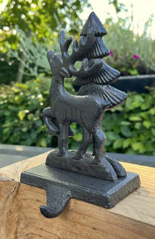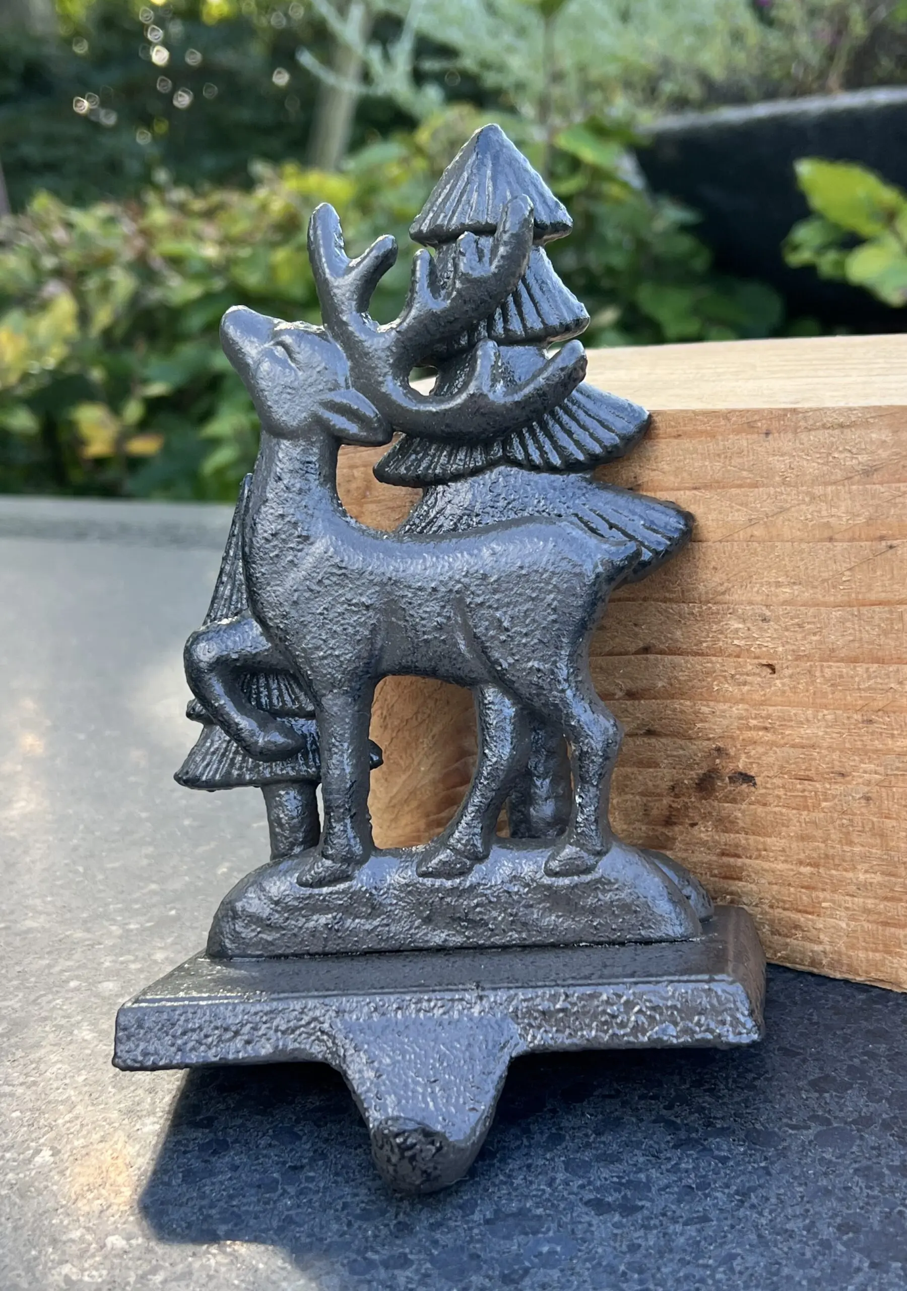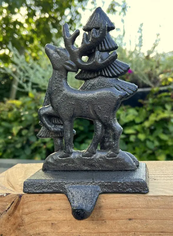 Een gietijzeren stocking hanger met hert en kerstboom, spar.
