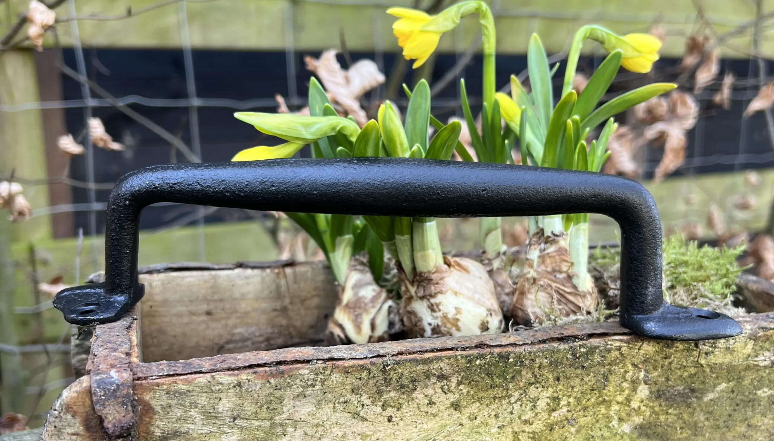 Een mooie strak vormgegeven gietijzeren handgreep.