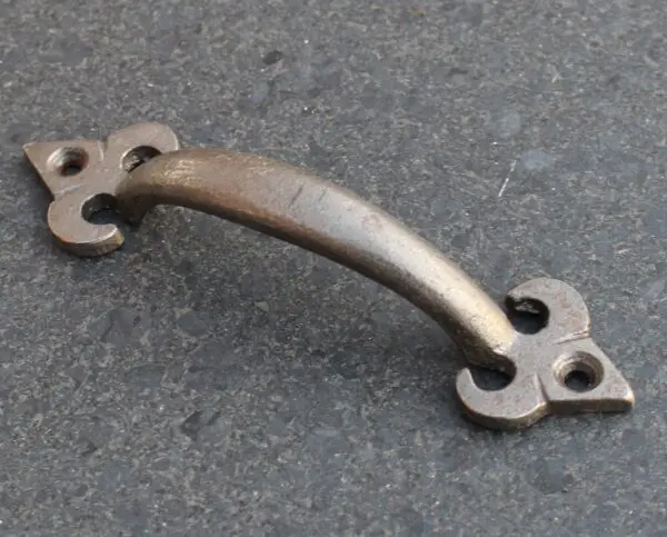 Mooie gietijzeren handgreep model Franse Lelie in een antraciet/ grijze kleur.