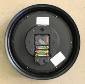 Een ronde klok met een bruine rand.