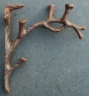 Donkerbruine gietijzeren plankdrager, in de vorm van een boomtak.