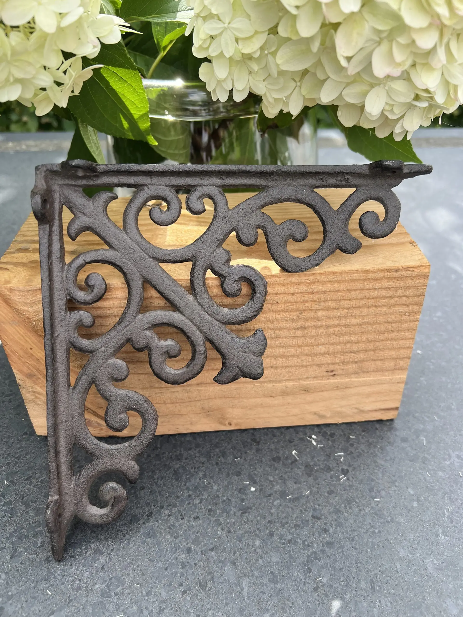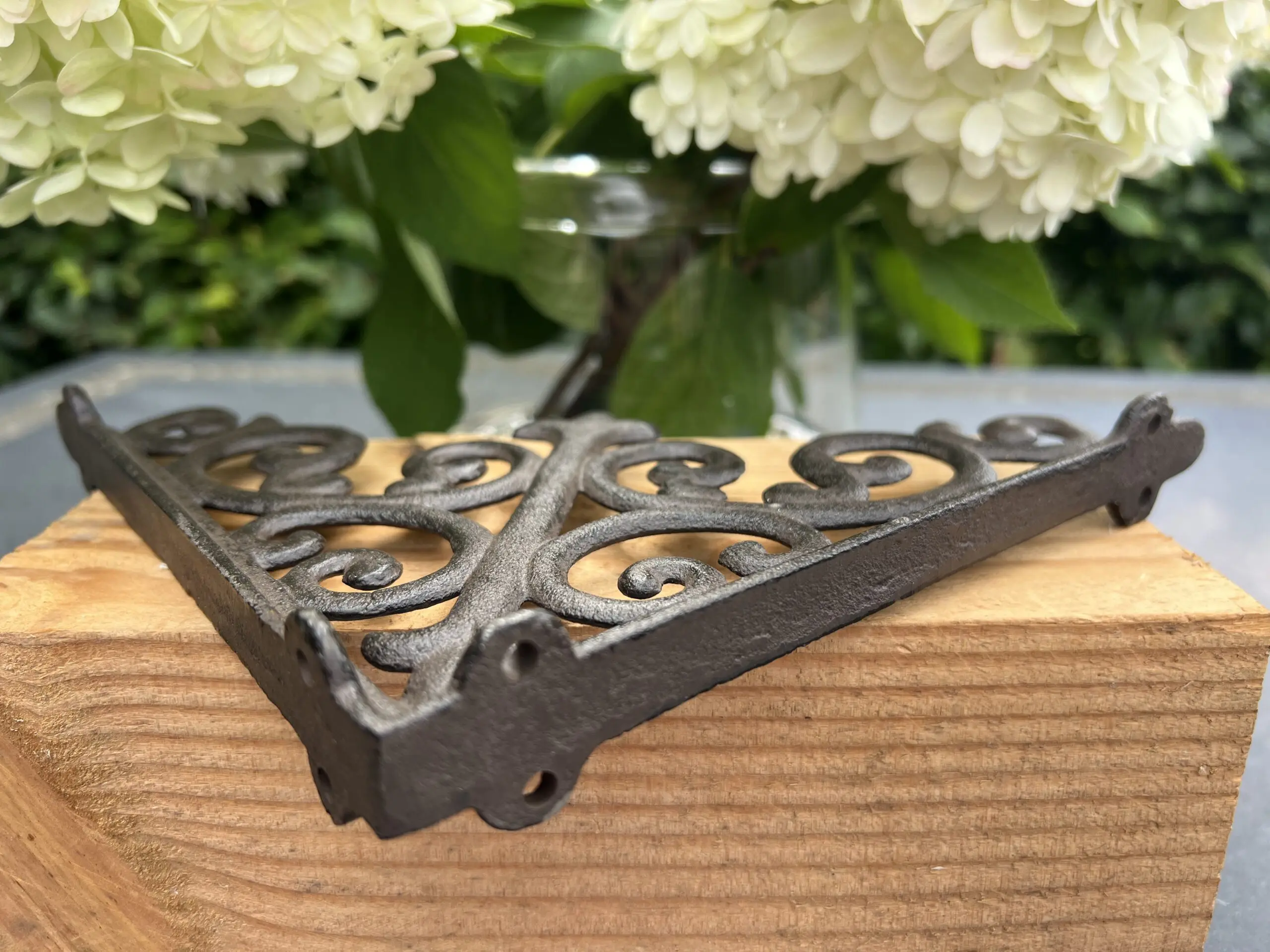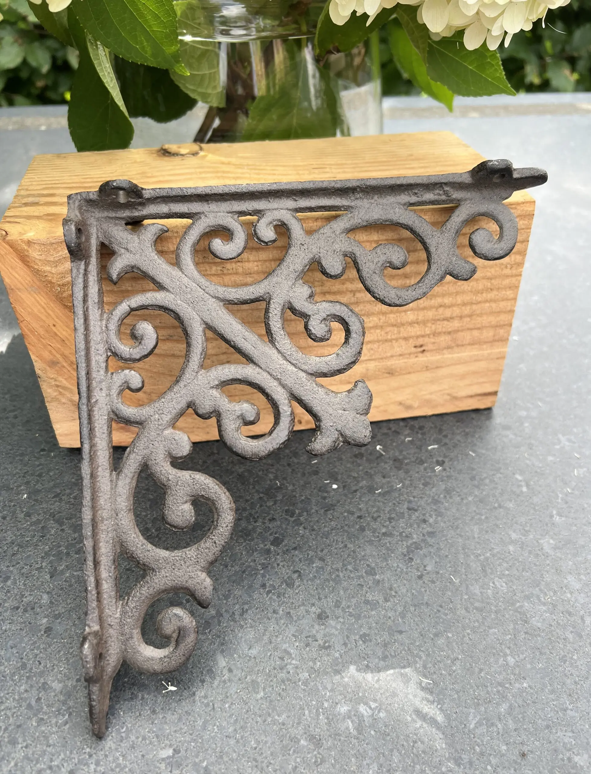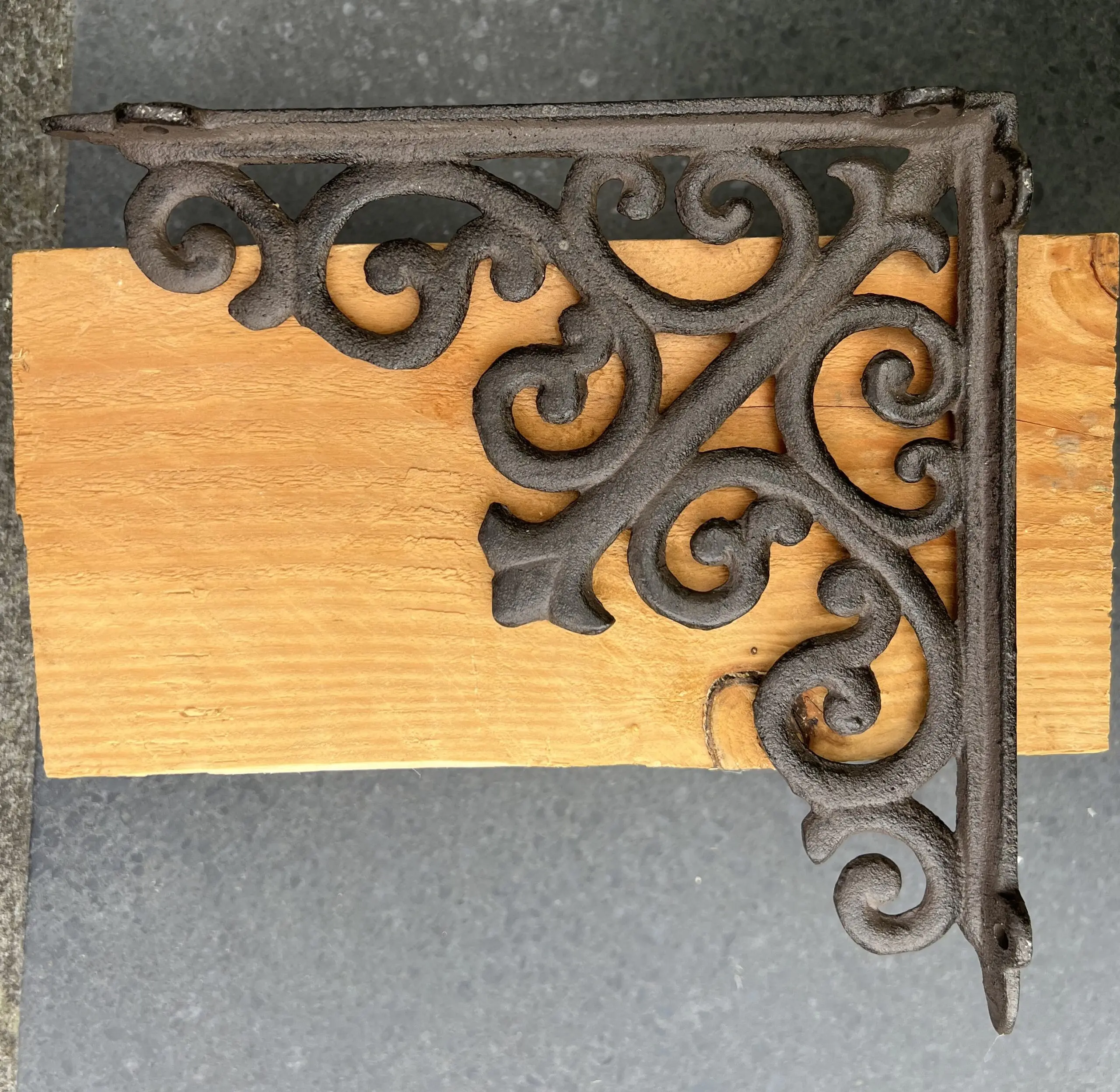 Een sierlijke gietijzeren plankdrager in een bruine kleur.