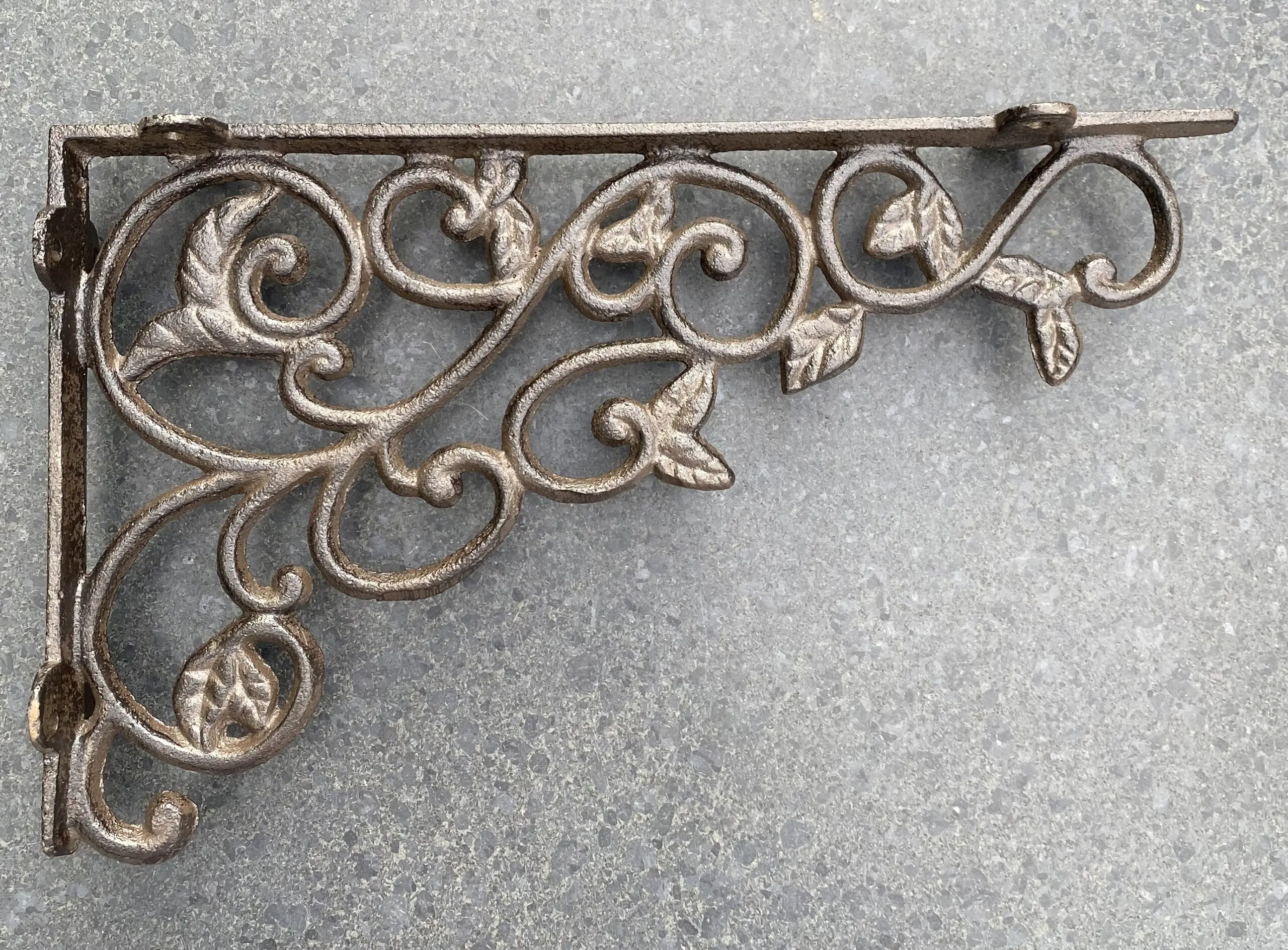 Sierlijke gietijzeren plankdrager met blaadjes in het midden.