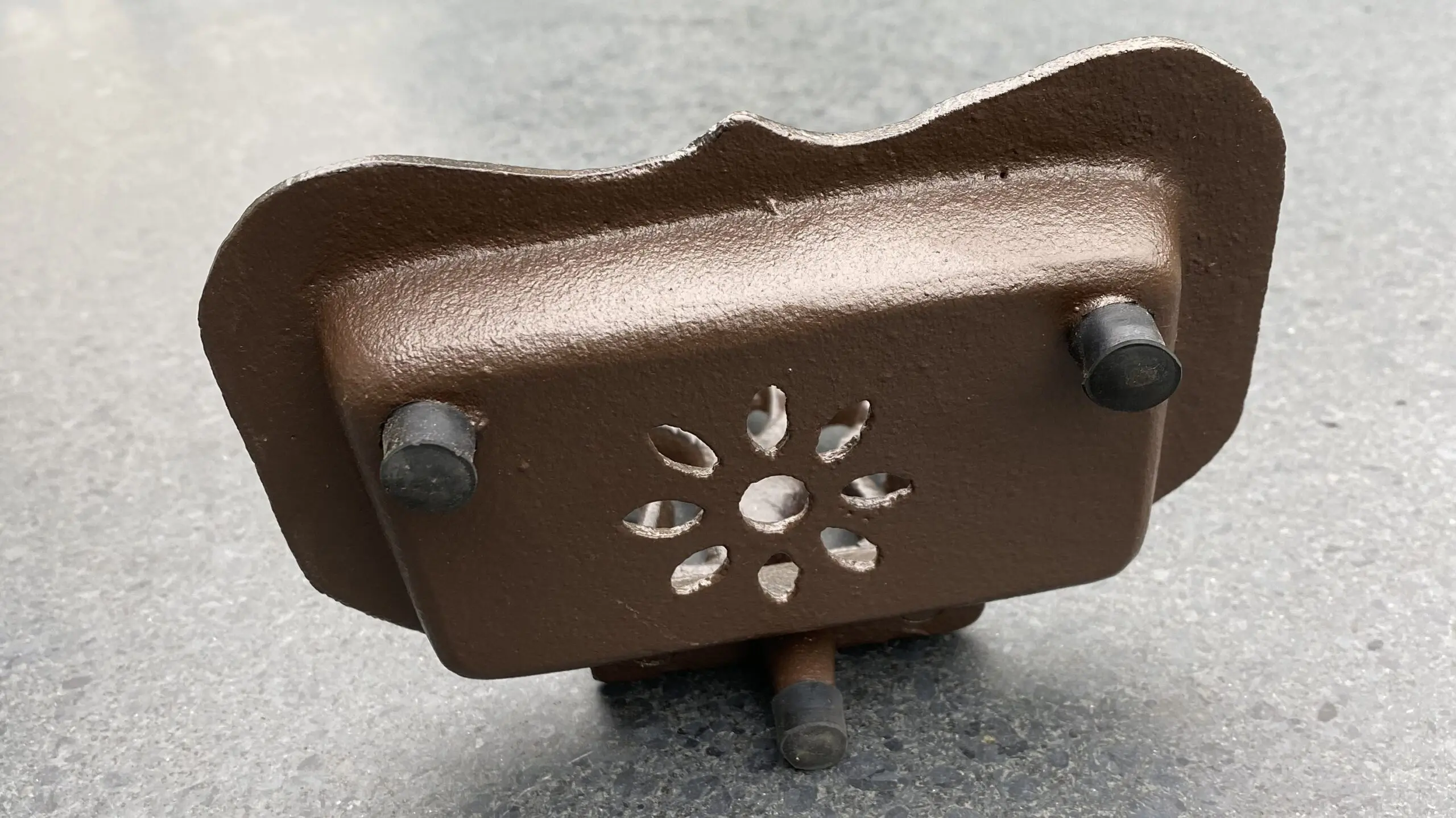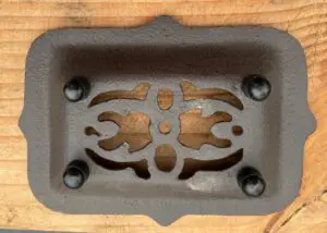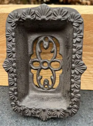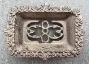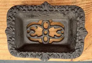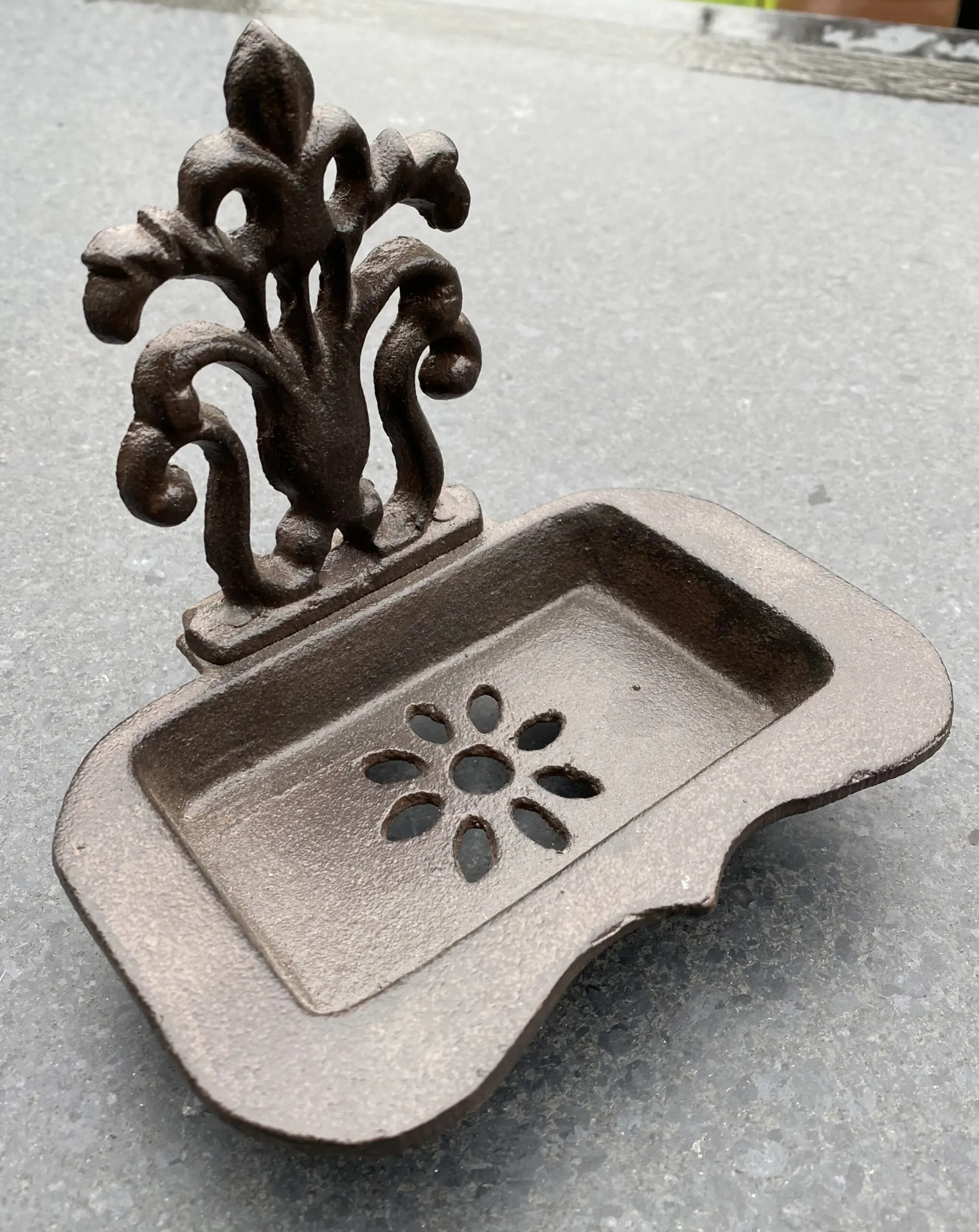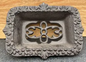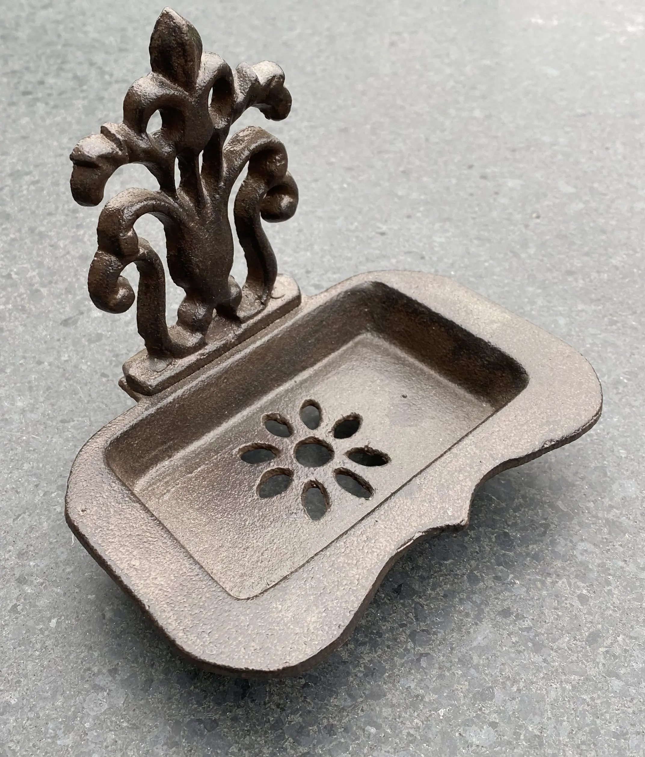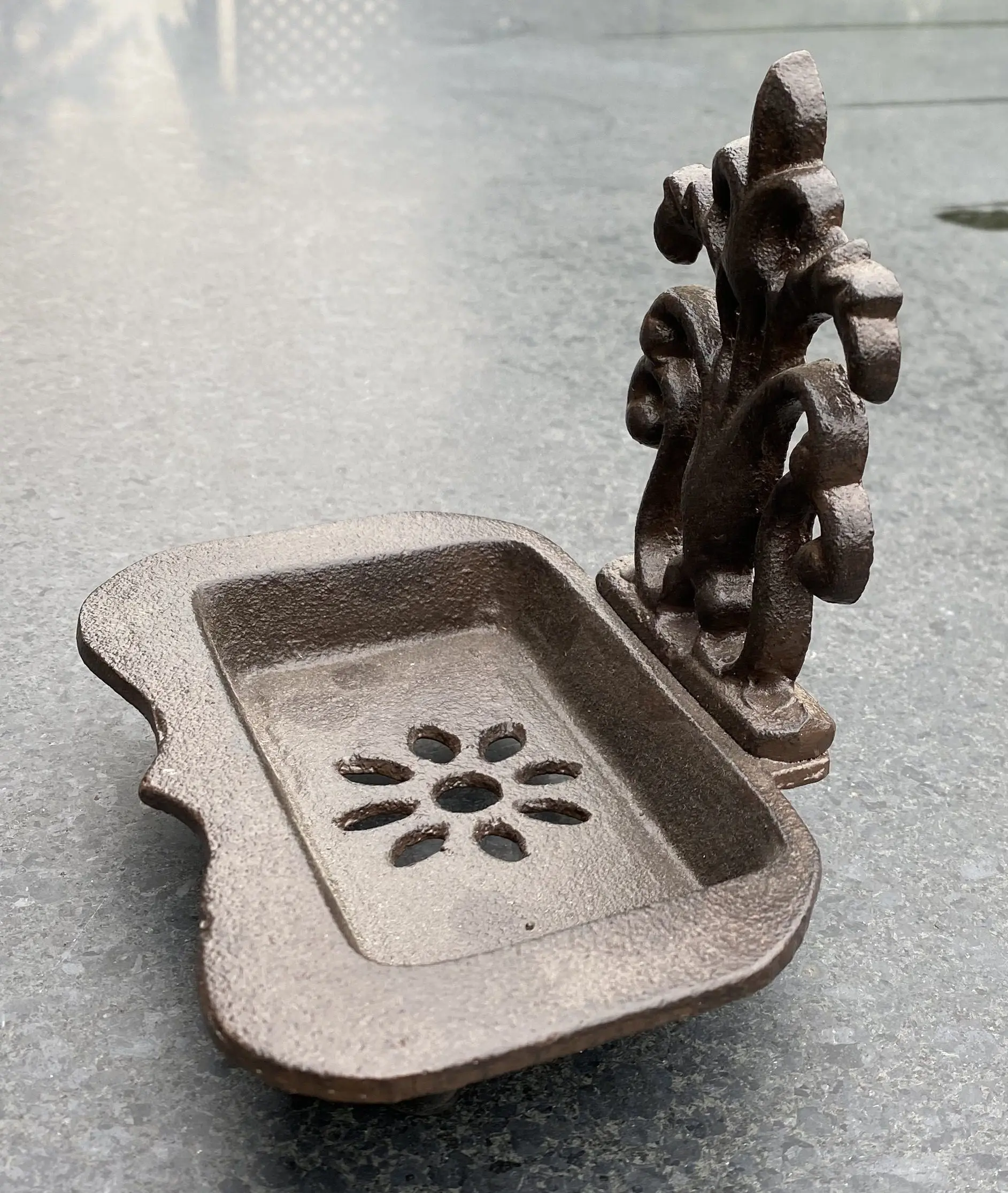 Een roestbruin gietijzeren zeepbakje die je kunt neerzetten.